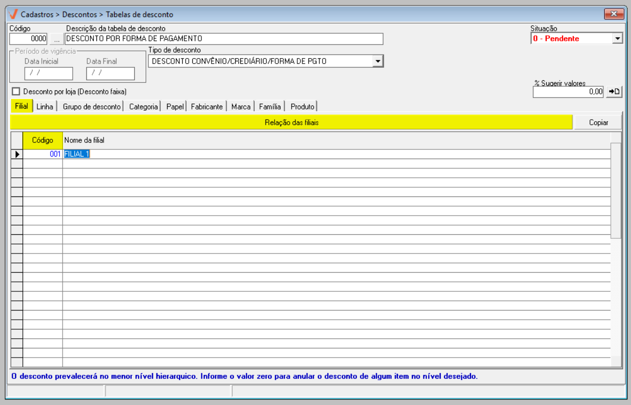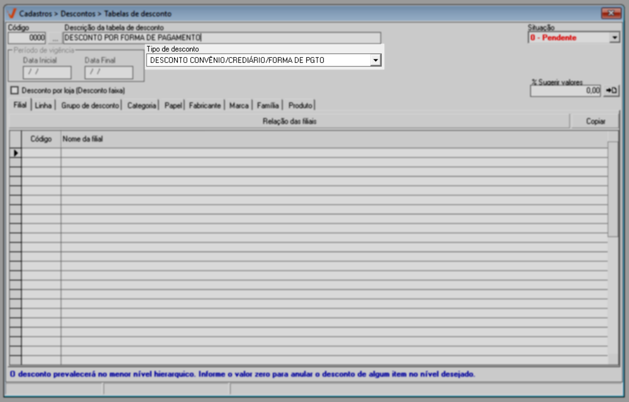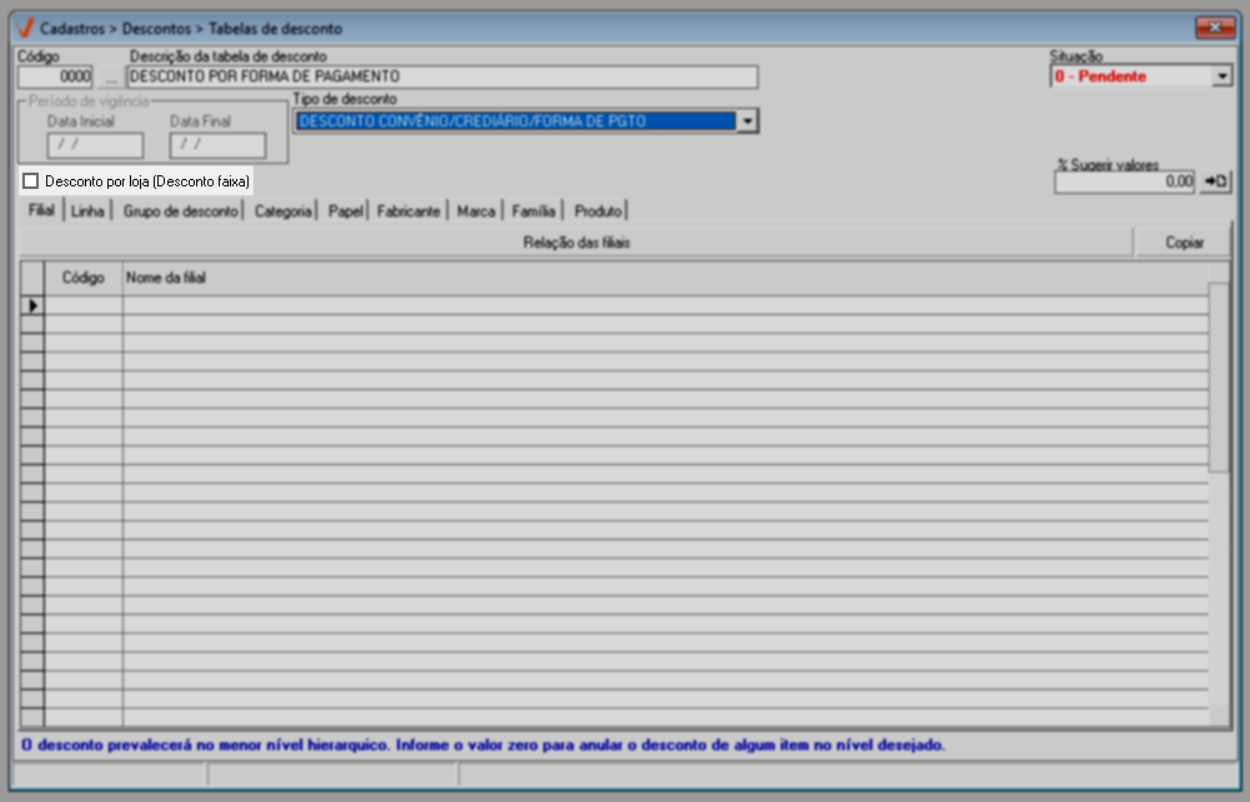 Neste artigo, o usuário aprenderá a realizar o cadastro, a consulta e a alteração da tabela de descontos do tipo "Desconto por Convênio/Crediário/Forma de Pagamento". Este programa de descontos é destinado aos clientes que optam por realizar o pagamento por meio de convênios ou crediário.
