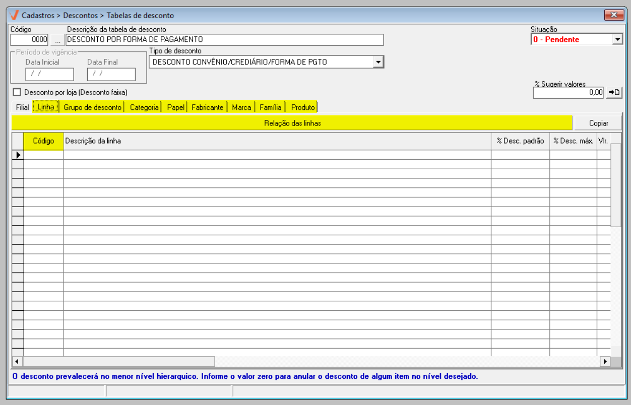 Para incluir na tabela de desconto todos os itens pertencentes a uma determinada "Linha", "Grupos de Desconto", "Categoria", "Papel", "Fabricante", "Marca" e/ou "Família", inicie clicando na aba de interesse. Como mencionado, as abas oferecem os mesmos campos para configuração do desconto. Portanto, para ilustrar essa configuração, será utilizada apenas uma dessas abas. O usuário pode replicar as mesmas orientações para configurar os demais critérios da árvore mercadológica conforme necessário em cada uma dessas categorias.