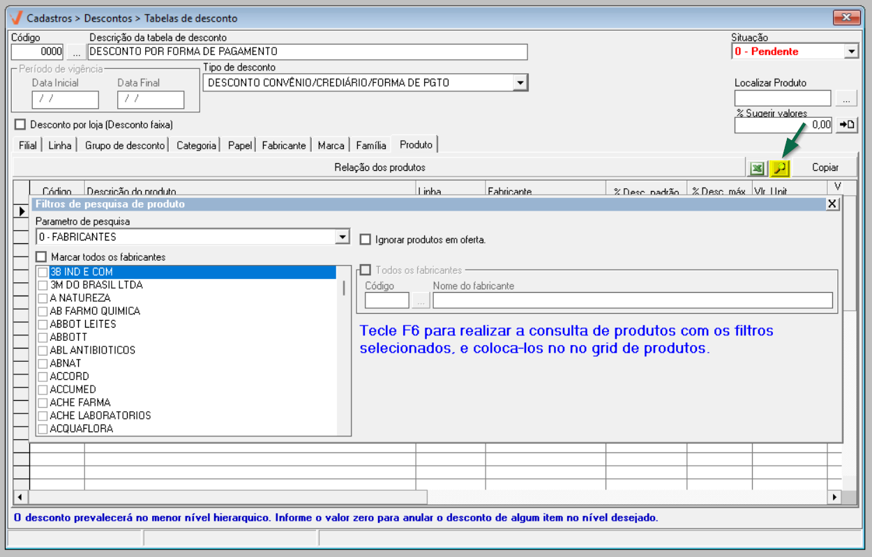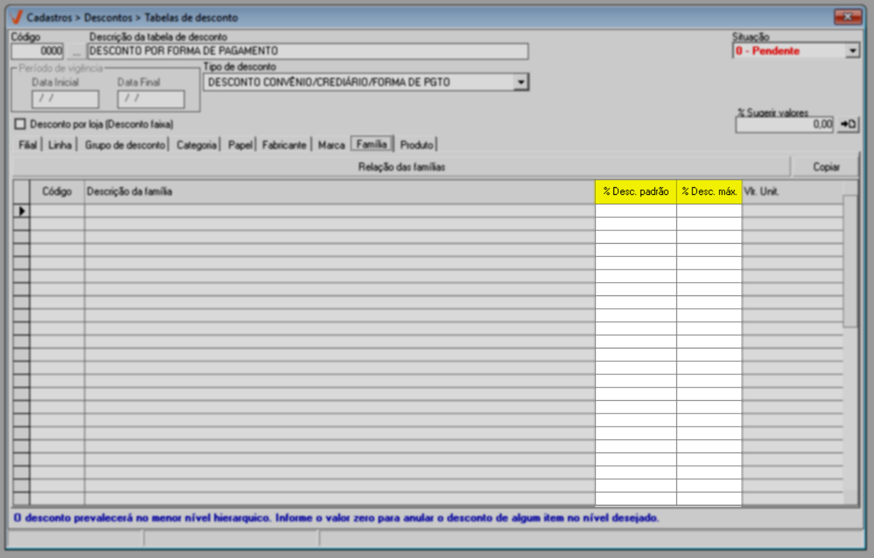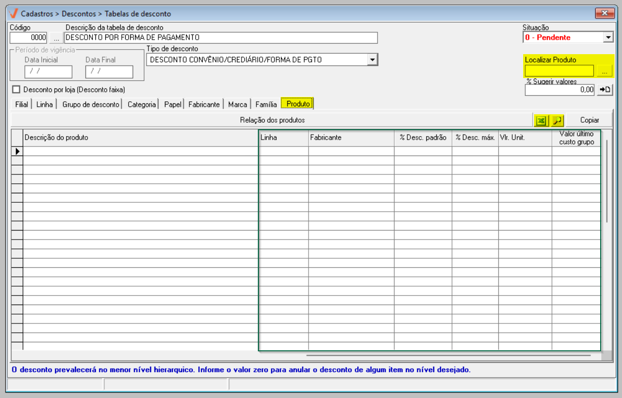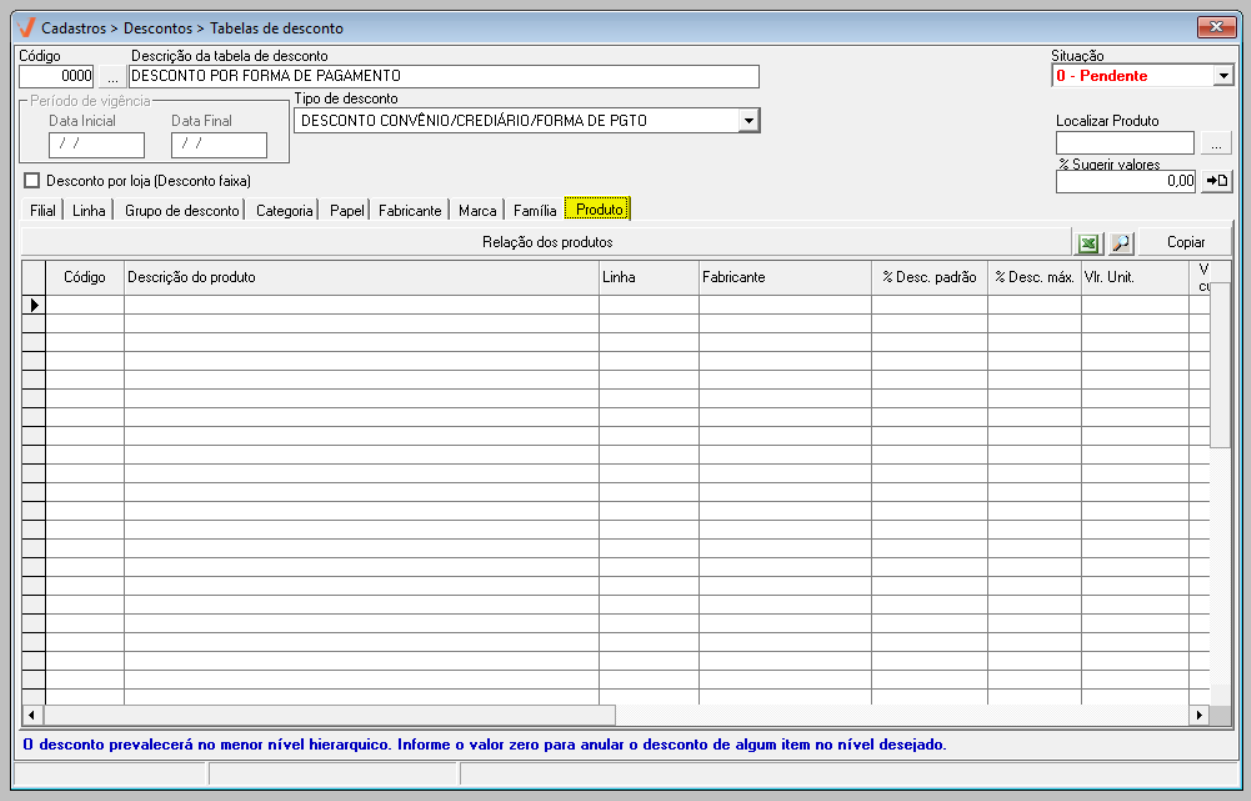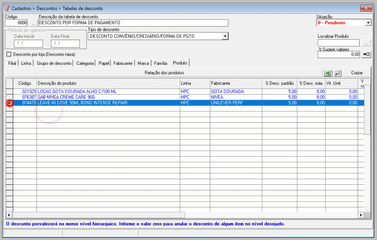 - Pendente: A tabela de desconto ainda não está disponível para uso. Ela poderá ser utilizada apenas quando o seu prazo de vigência começar.
