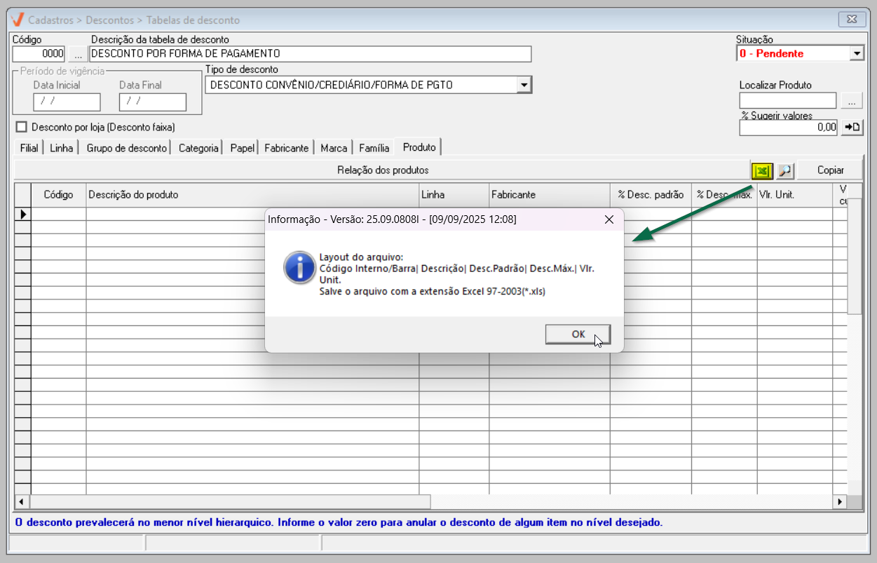 O método de importação permite ao usuário inserir todos os produtos e suas respectivas configurações de desconto, desde que o arquivo esteja corretamente formatado de acordo com o layout aceito pelo sistema. Para utilizar essa opção, clique no botão com o ícone do "Excel" para visualizar o layout aceito pelo sistema.