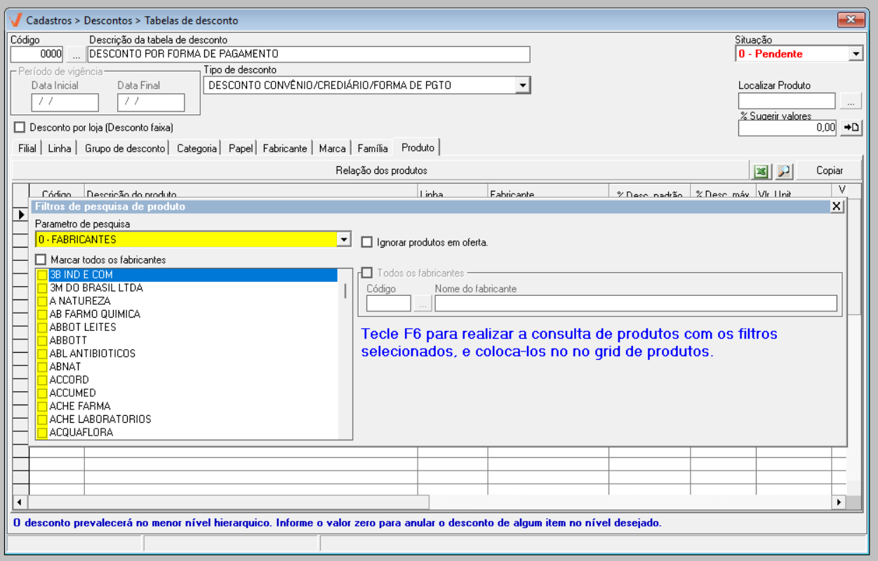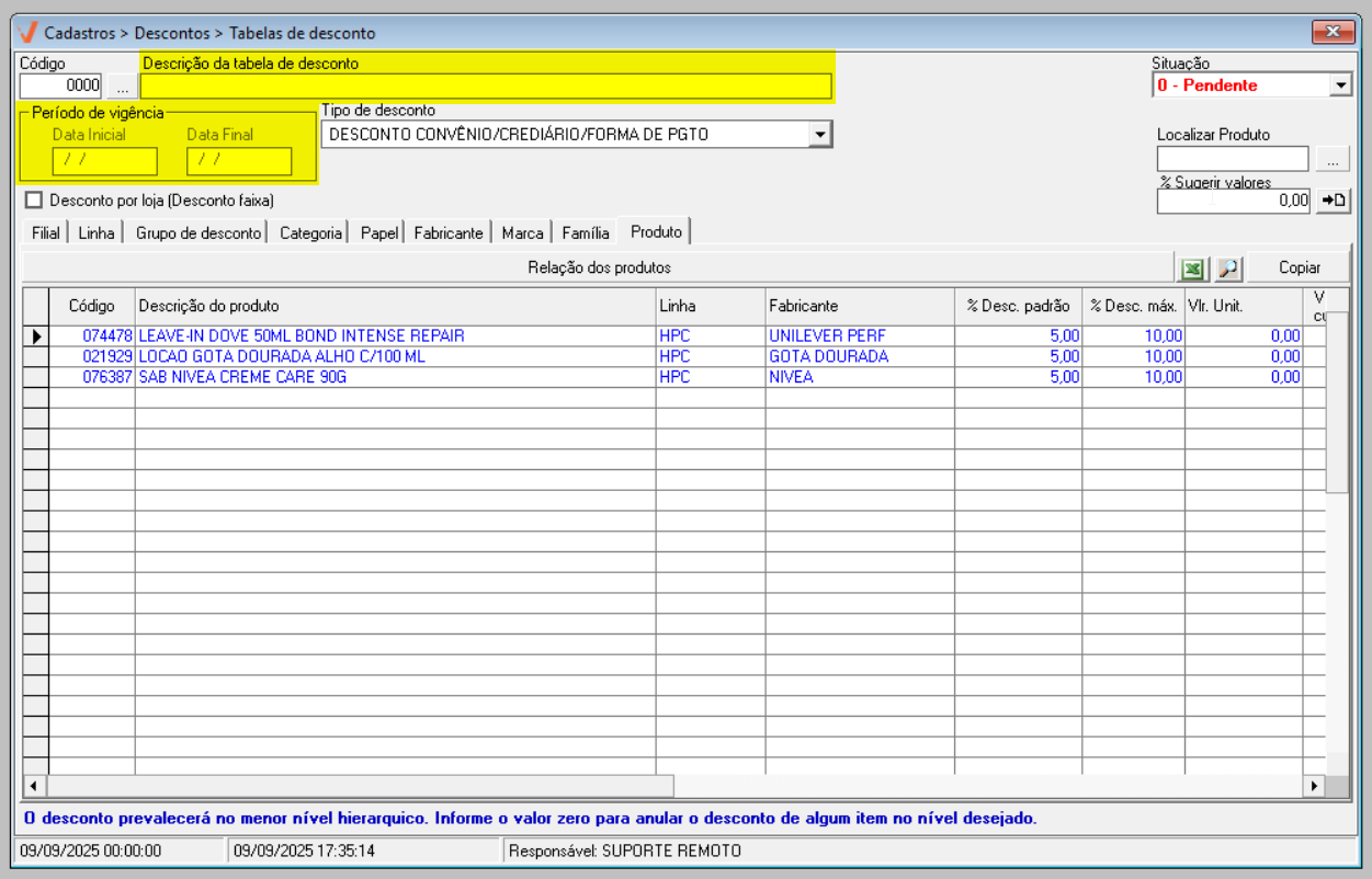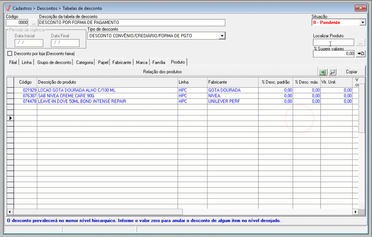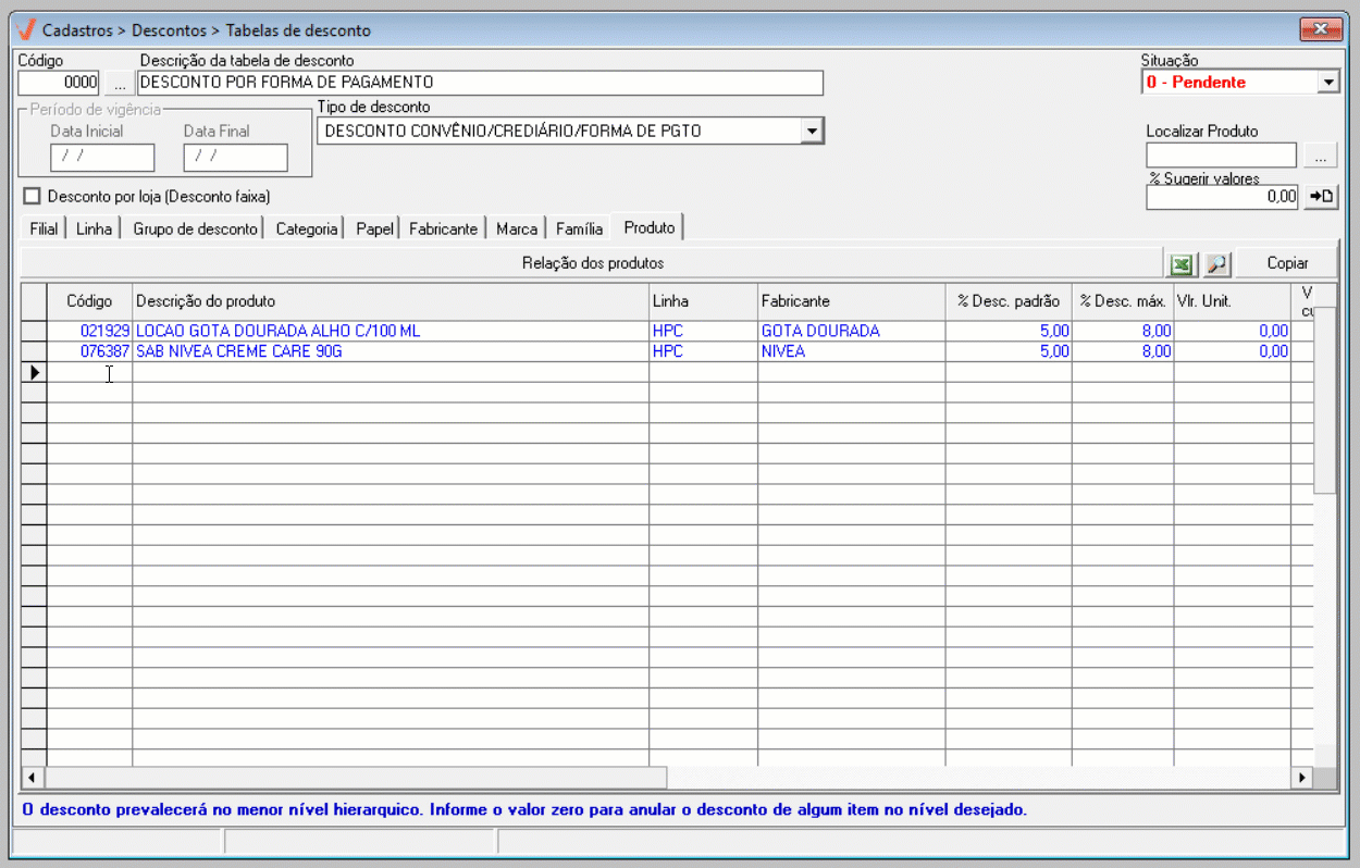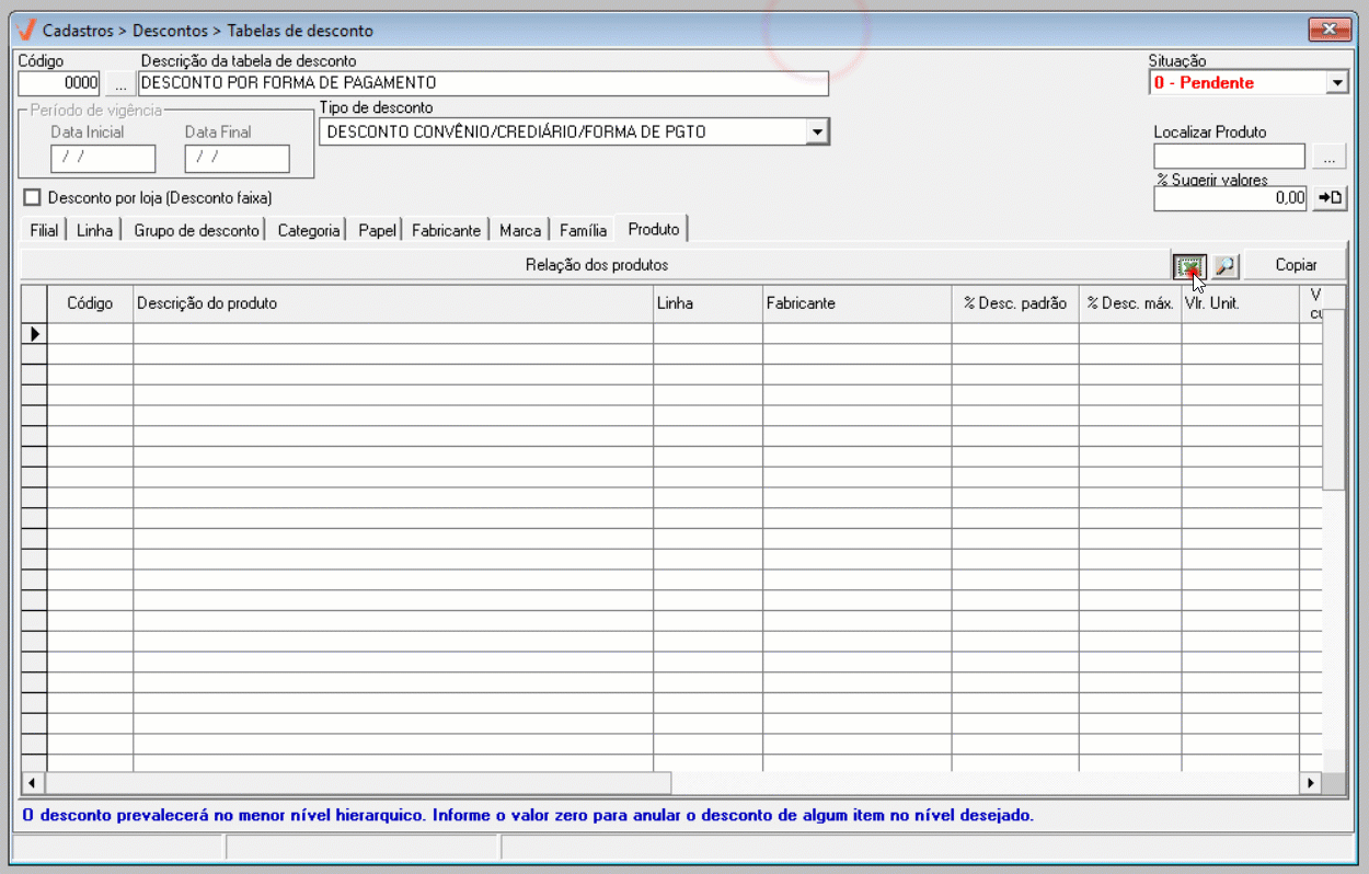 - Para realizar o cadastro de uma tabela de descontos é necessário que os produtos estejam previamente cadastrados no sistema.