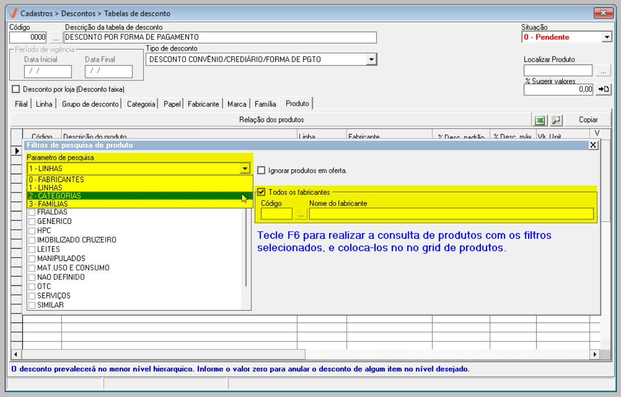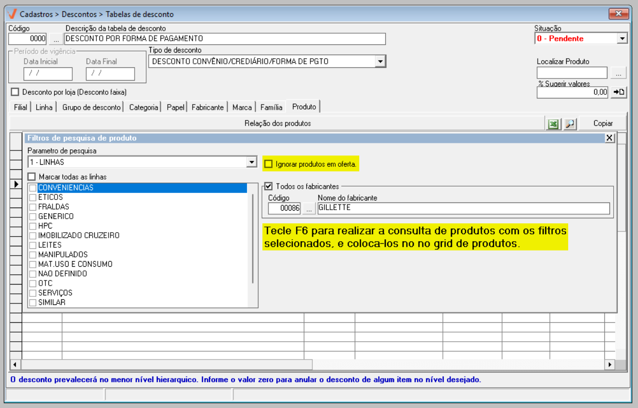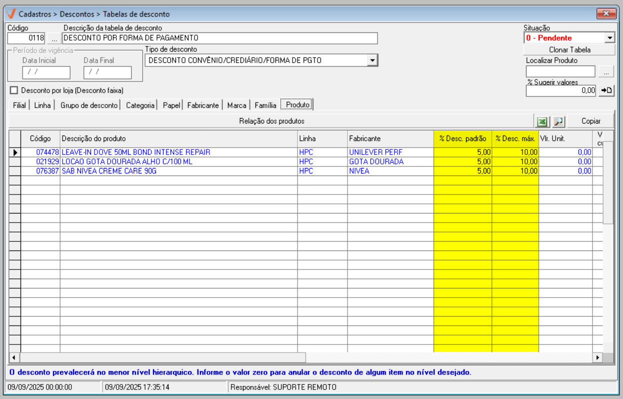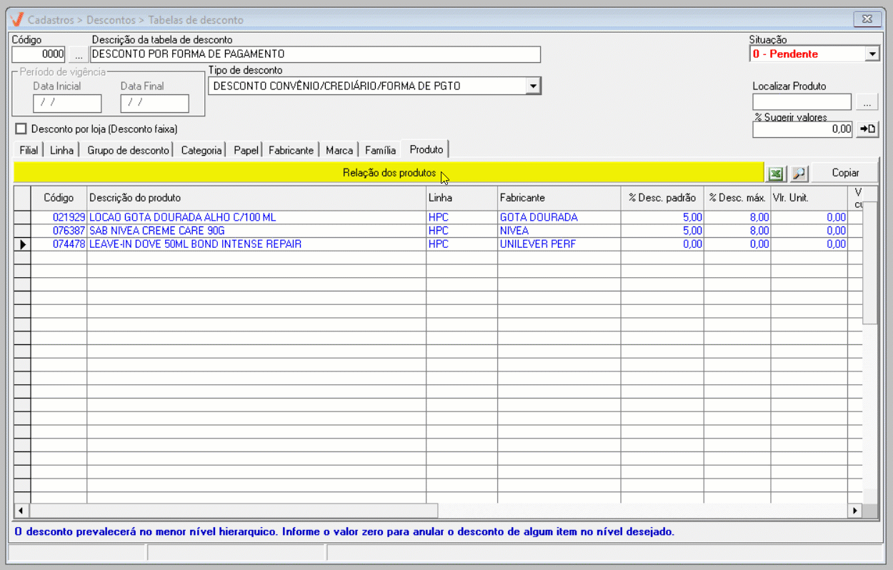 Outro aspecto importante a ser destacado, é o informativo no rodapé da tela, "O desconto prevalecerá no menor nível hierárquico". Por exemplo, caso o usuário defina 50% de desconto na aba de Linhas e 40% na aba de Produto, o sistema aplicará o desconto de 40%, que corresponde ao nível mais detalhado, ou seja, o produto específico. Em resumo, os valores configurados no nível mais específico sempre prevalecerão sobre aqueles definidos em níveis mais gerais, como a linha de produtos.