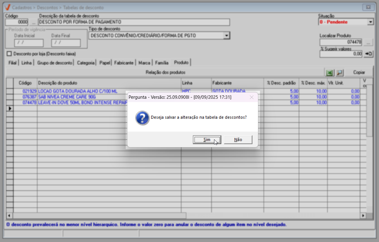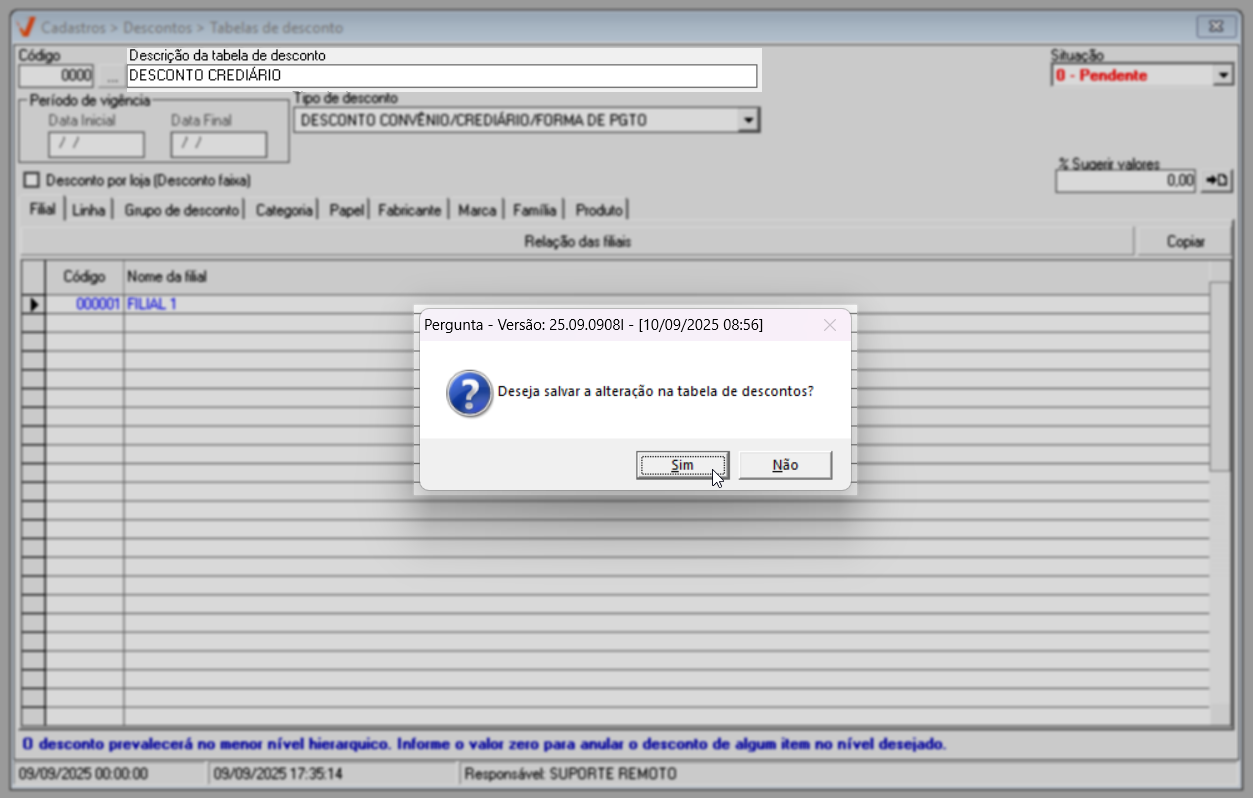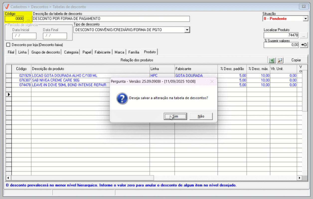 Para concluir o cadastro, pressione a tecla F2 para salvar. Em seguida, será exibida a mensagem "Deseja salvar a alteração na tabela de descontos?", clique em "Sim" para confirmar a operação. Logo depois, uma nova mensagem será apresentada informando "Registro gravado com sucesso". Clique em "Ok" para confirmar e a tela será automaticamente limpa, permitindo o início de uma nova operação.
