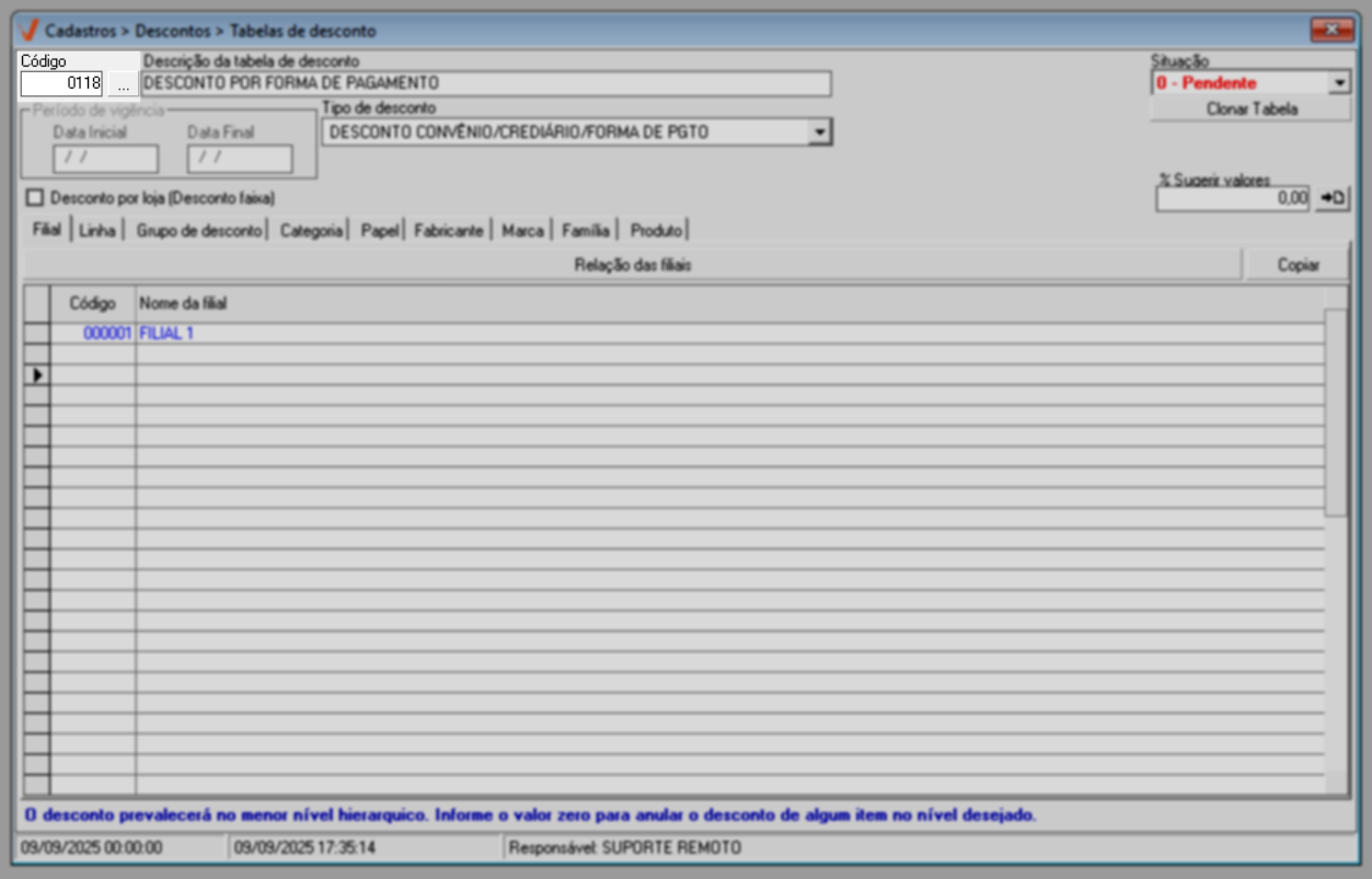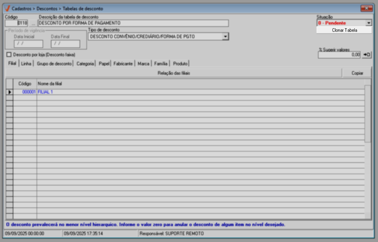 - Vigente: A tabela de desconto está ativa e disponível para uso imediato. Ela está em funcionamento dentro do sistema, sendo aplicada conforme o estabelecido.