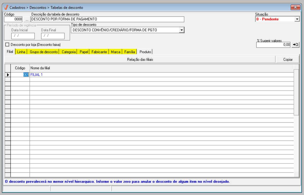 O próximo passo é configurar os detalhes dos descontos por meio das abas disponíveis na seção abaixo. Comece pela aba "Filial" e adicione todas as filiais que irão oferecer o desconto. Para isso, utilize as linhas da coluna "Código" para informar o o código de cadastro da filial, tecle >>Enter para revelar o nome correspondente no campo à frente.