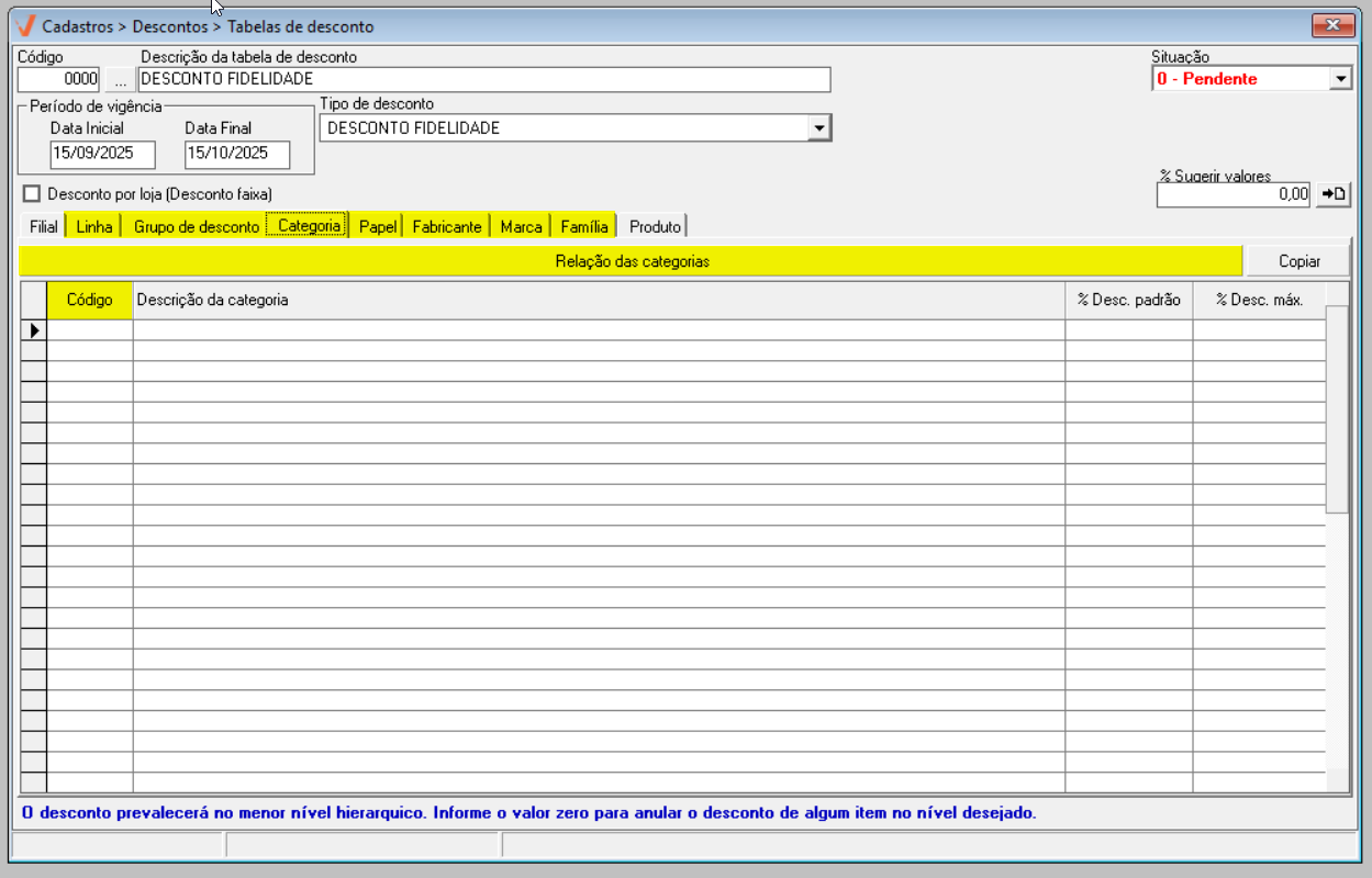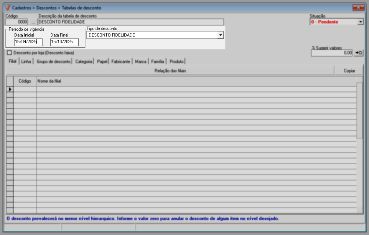 - Pendente: A tabela de desconto ainda não está disponível para uso. Ela poderá ser utilizada apenas quando o seu prazo de vigência começar.
