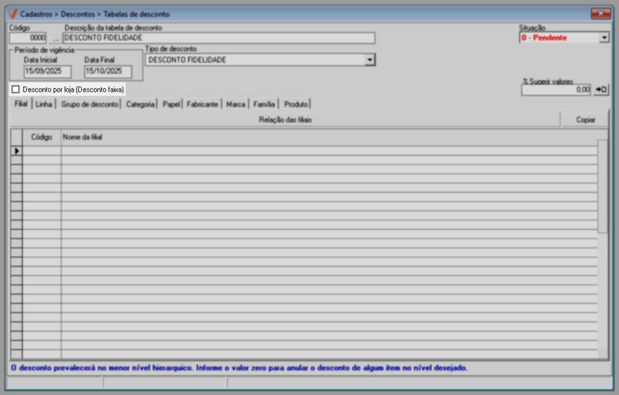 - Finalizado: A tabela de desconto está desativada e não está em uso no sistema, independentemente do seu prazo de vigência.