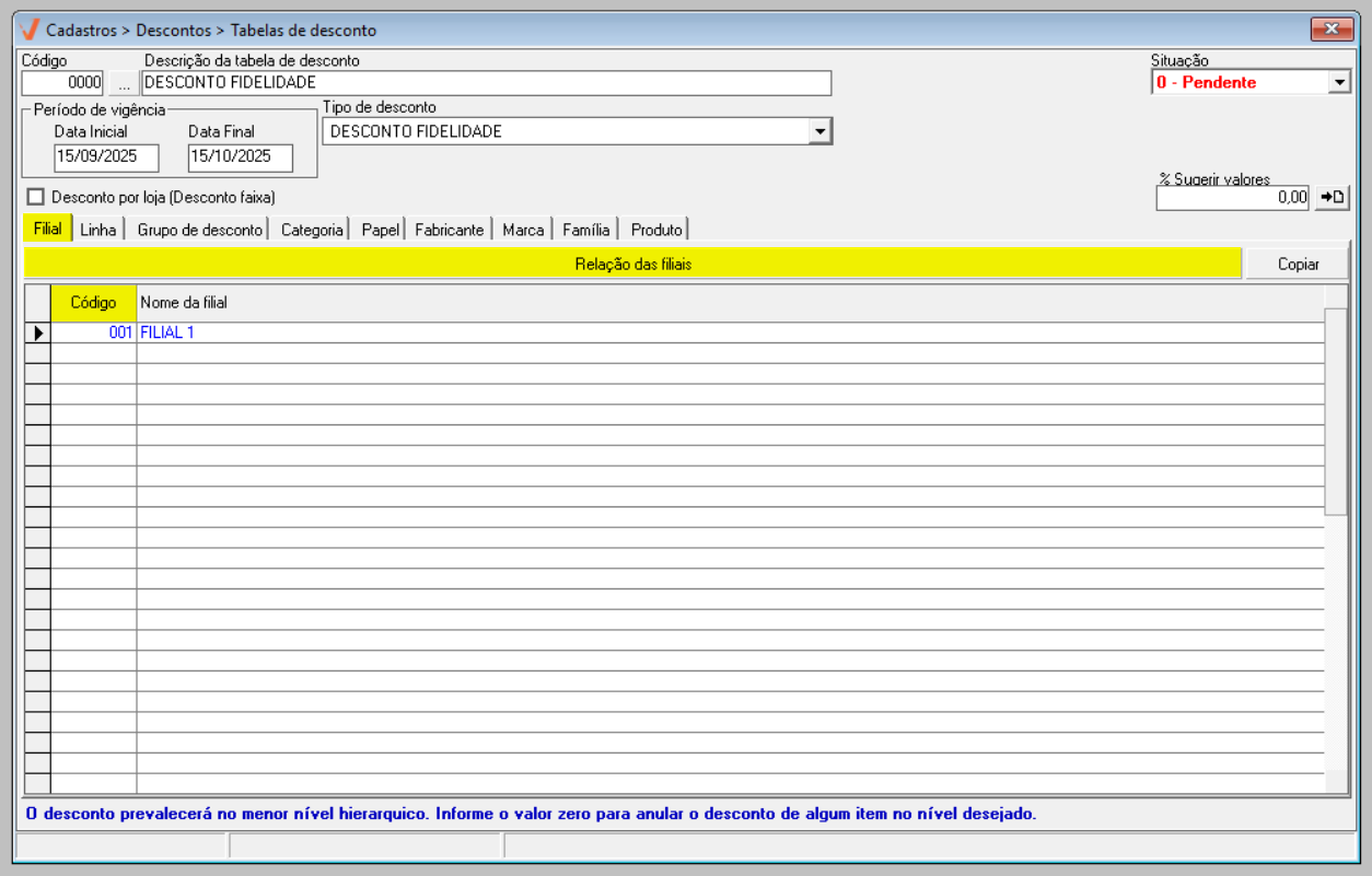 É importante destacar que caso tenha realizado a marcação da opção “Desconto por loja (desconto faixa), é essencial informar apenas uma filial. Se mais de uma filial for vinculada à mesma tabela, não será possível aplicar o desconto faixa.