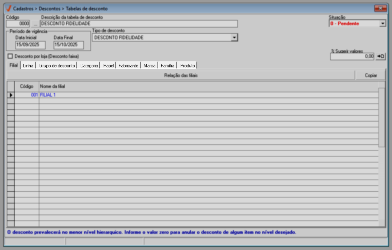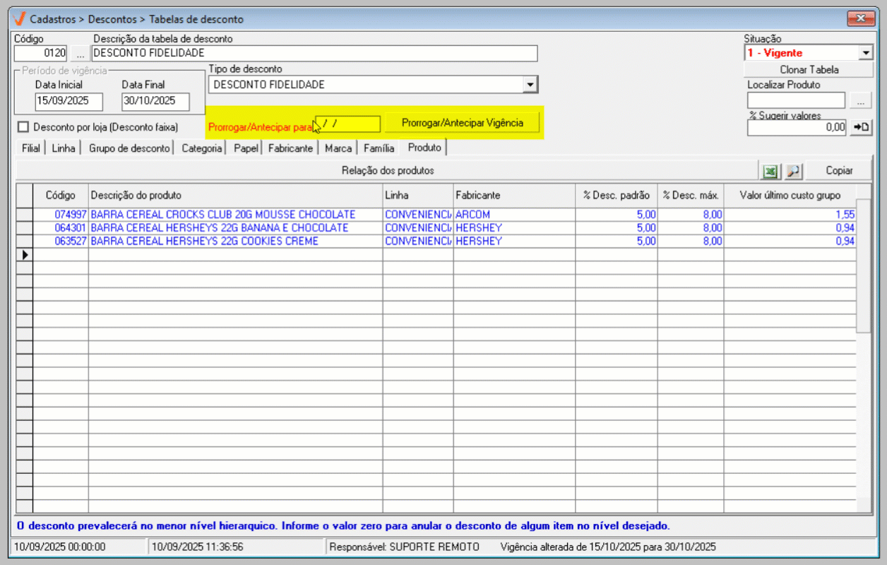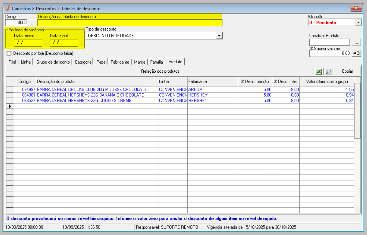 - Vigente: A tabela de desconto está ativa e disponível para uso imediato. Ela está em funcionamento dentro do sistema, sendo aplicada conforme o estabelecido.