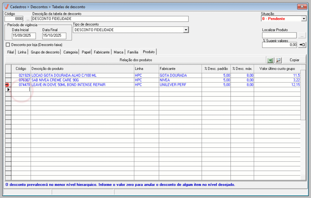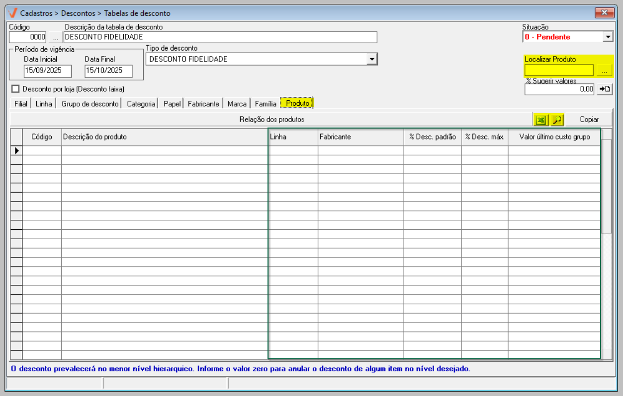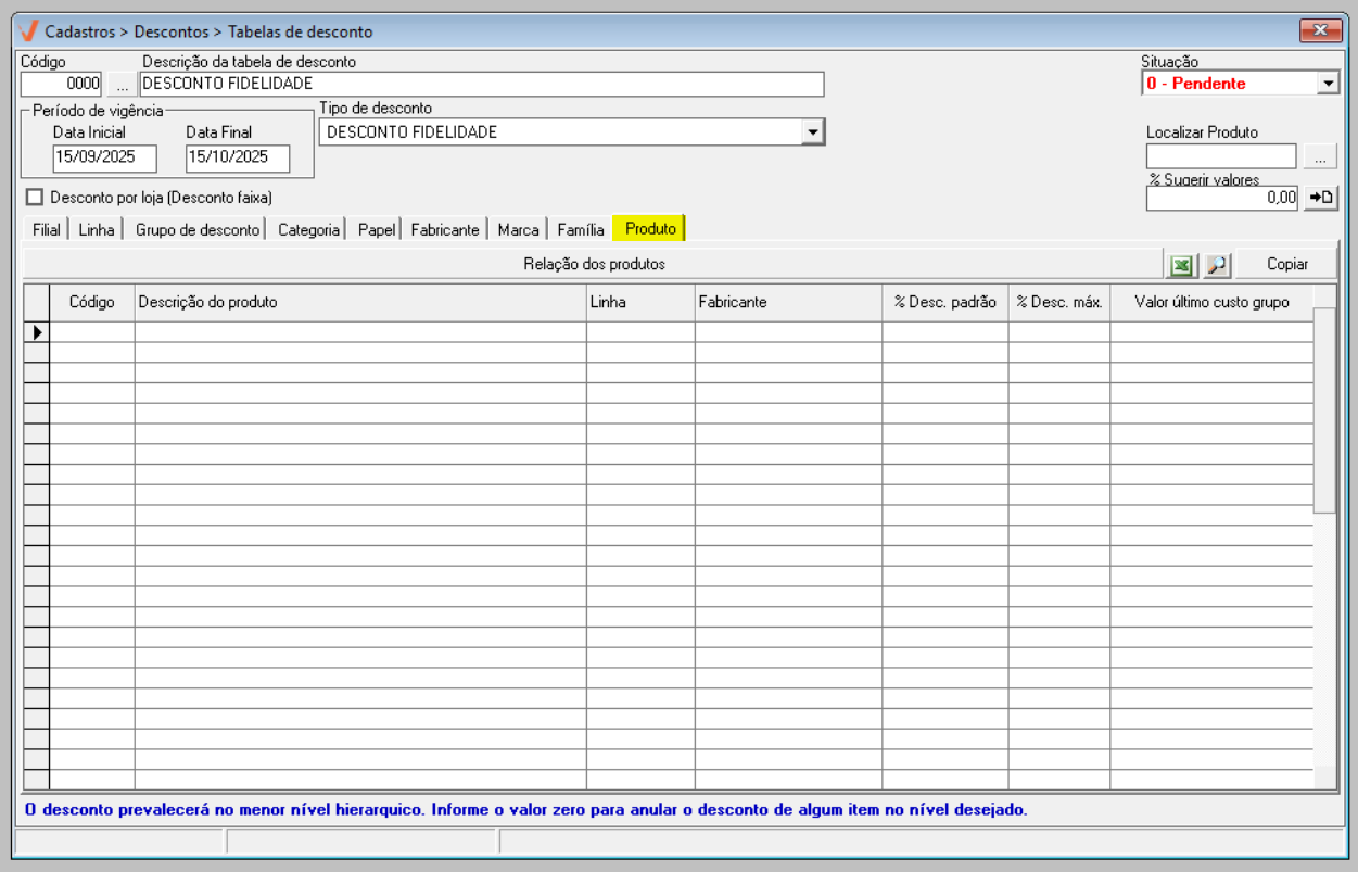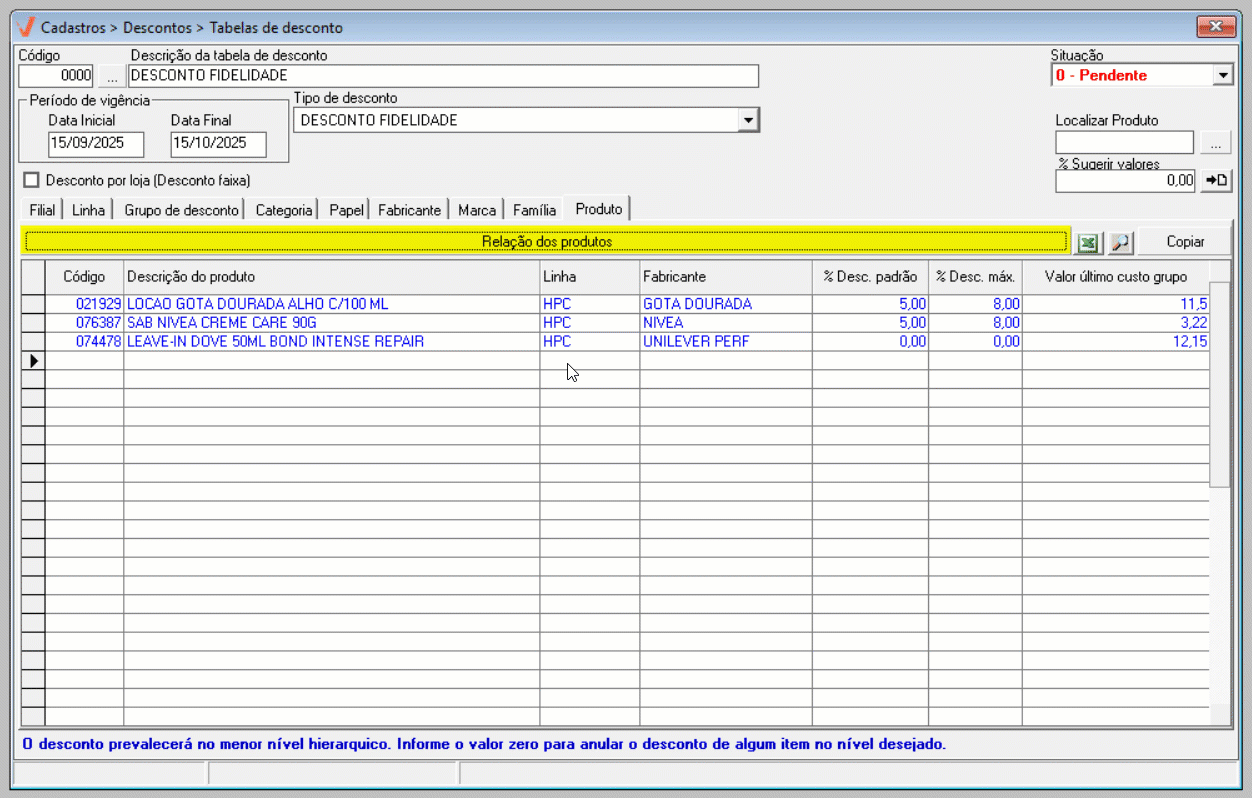 - Cadastro Prévio dos Produtos: É fundamental que todos os produtos estejam previamente cadastrados no sistema antes de configurar uma tabela de descontos.