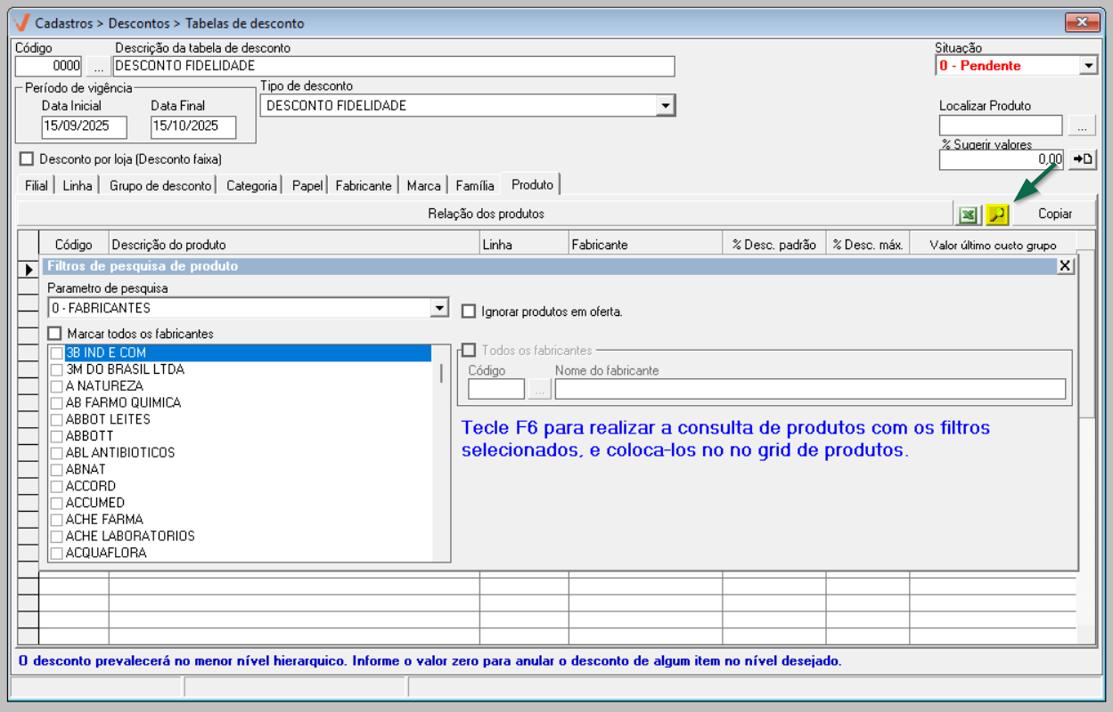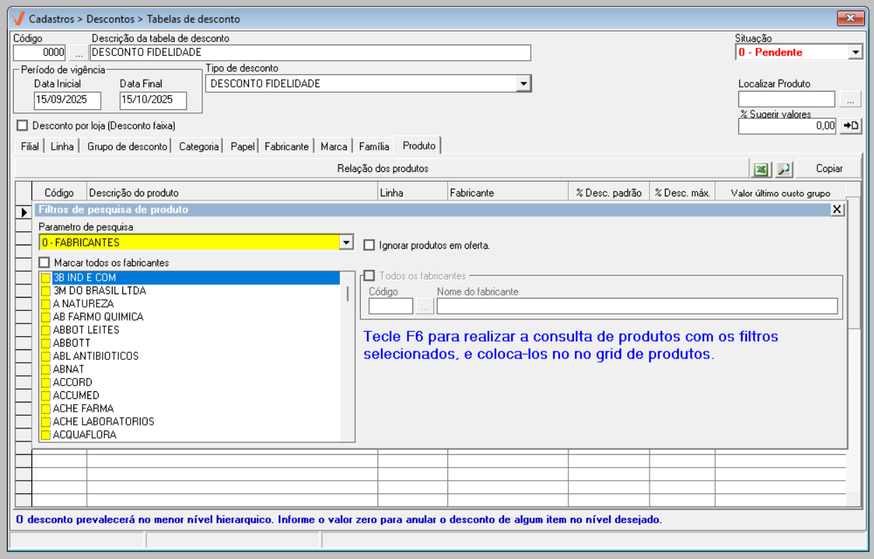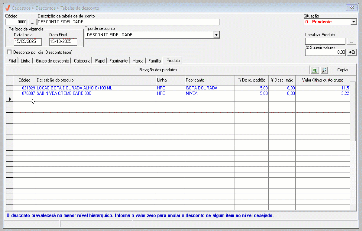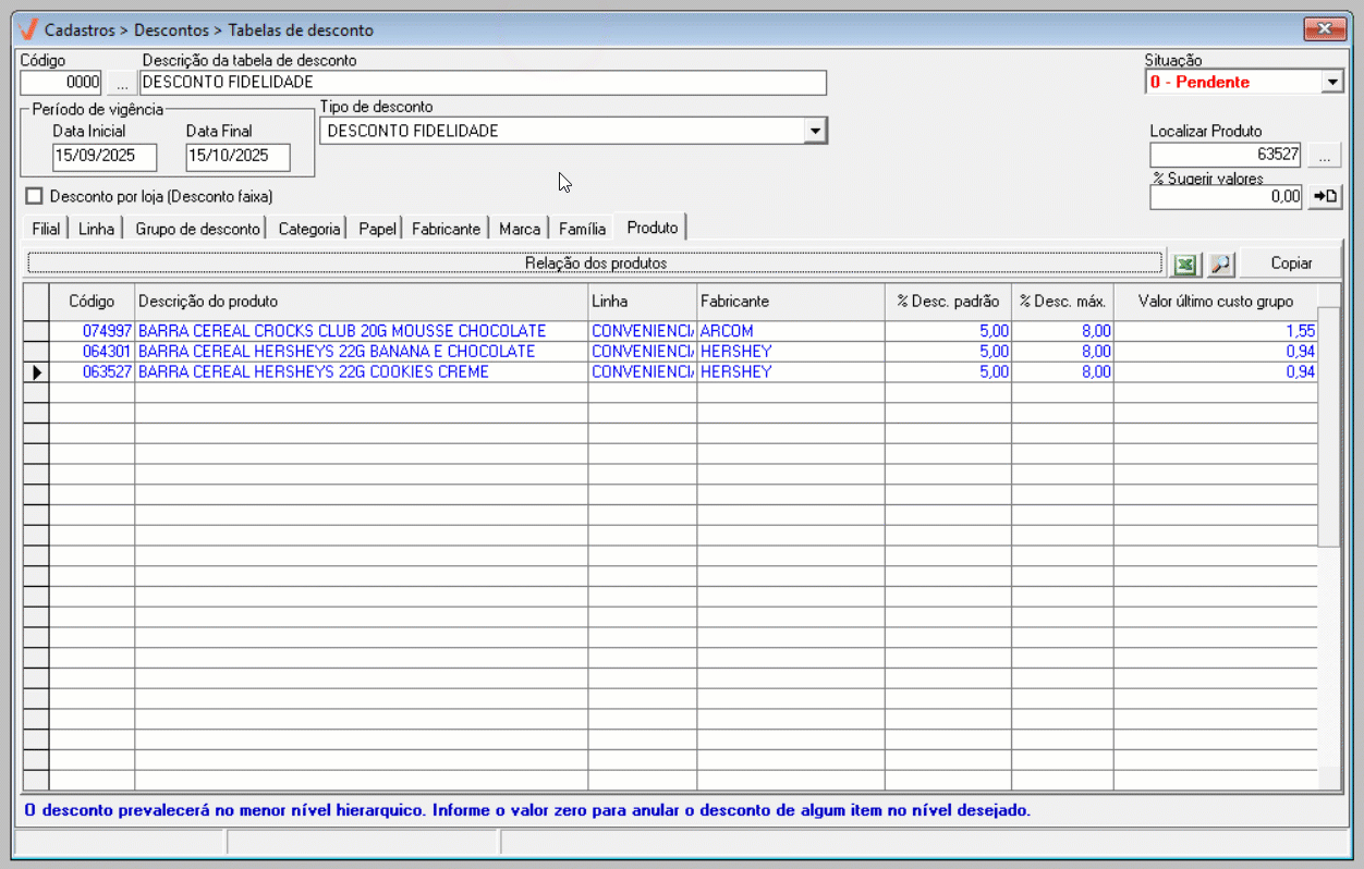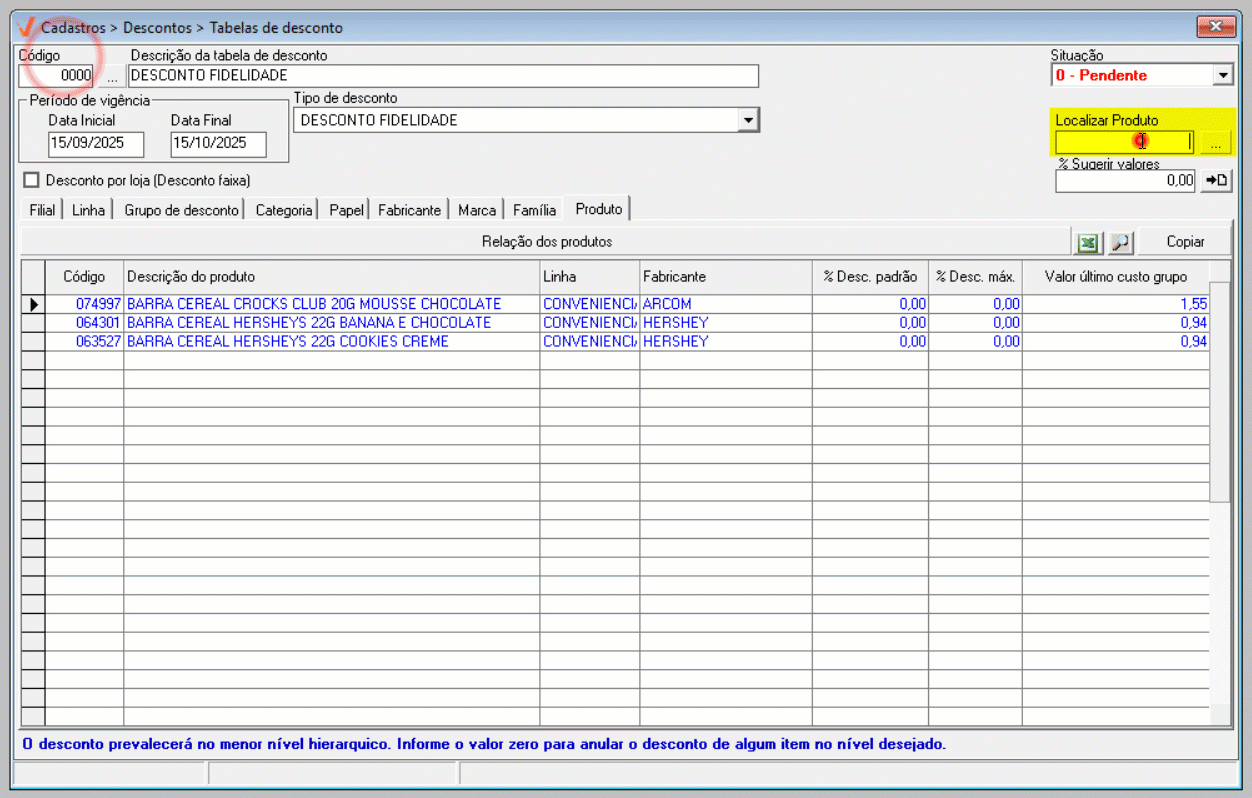 - Cadastro Prévio dos Produtos: É fundamental que todos os produtos estejam previamente cadastrados no sistema antes de configurar uma tabela de descontos.