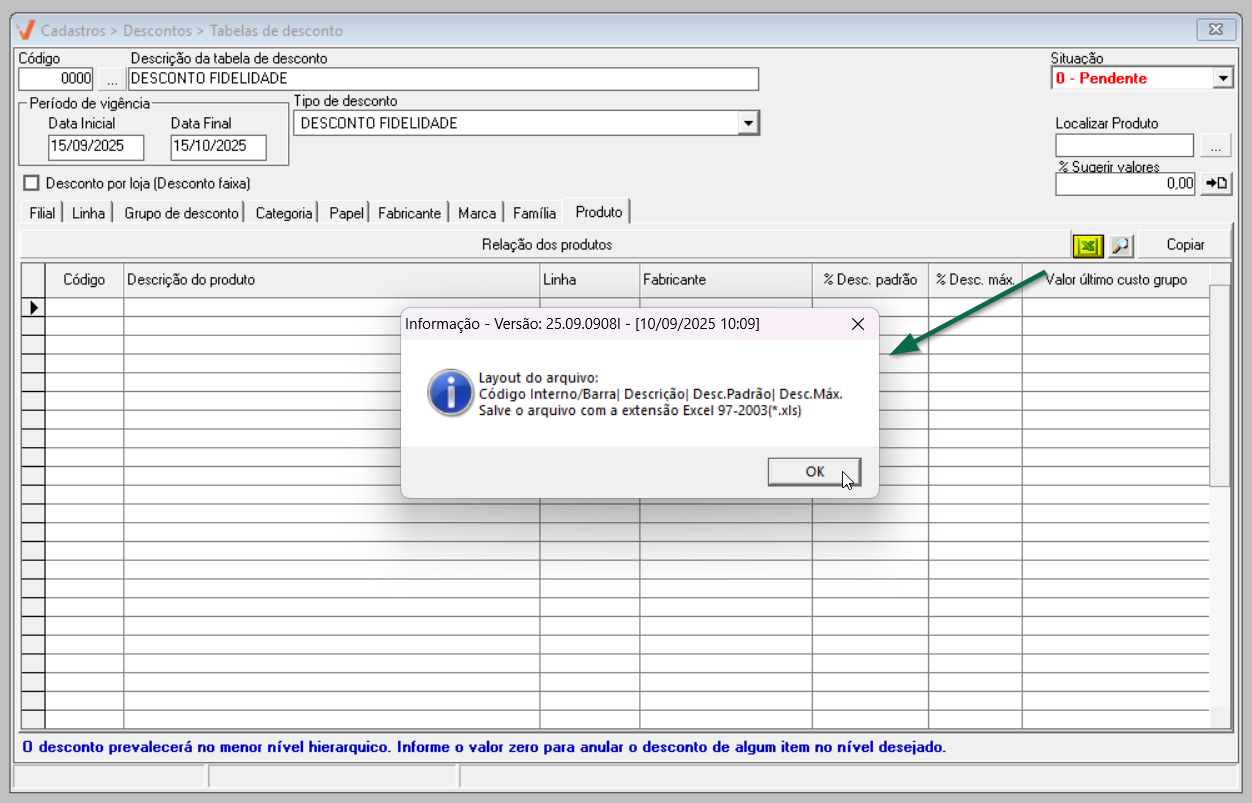 O método de importação permite ao usuário inserir todos os produtos e suas respectivas configurações de desconto, desde que o arquivo esteja corretamente formatado de acordo com o layout aceito pelo sistema. Para utilizar essa opção, clique no botão com o ícone do "Excel" para visualizar o layout aceito pelo sistema.
