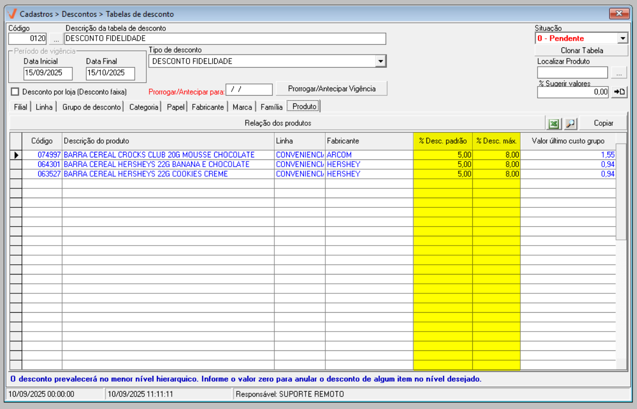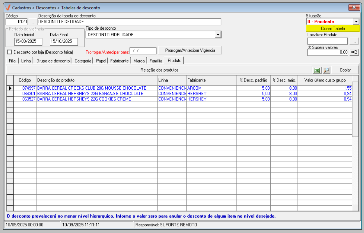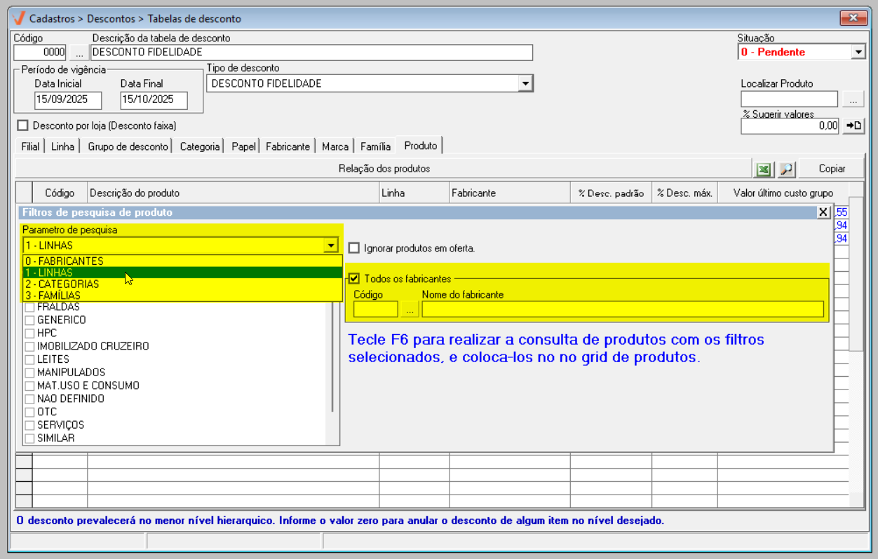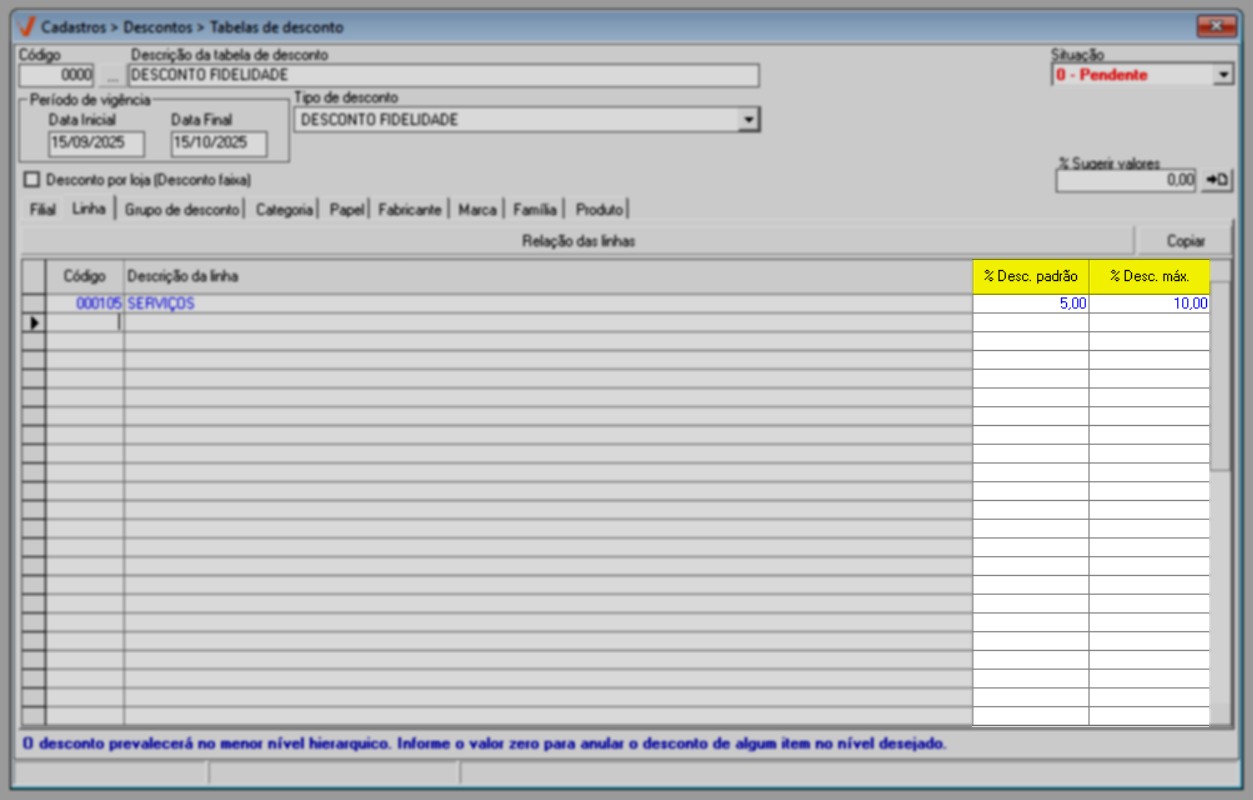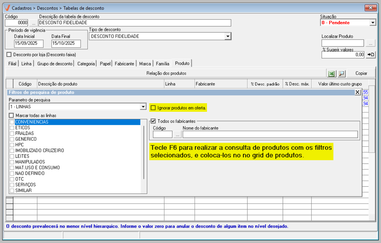 Outro aspecto importante a ser destacado, é o informativo no rodapé da tela, "O desconto prevalecerá no menor nível hierárquico". Por exemplo, caso o usuário defina 50% de desconto na aba de Linhas e 40% na aba de Produto, o sistema aplicará o desconto de 40%, que corresponde ao nível mais detalhado, ou seja, o produto específico. Em resumo, os valores configurados no nível mais específico sempre prevalecerão sobre aqueles definidos em níveis mais gerais, como a linha de produtos.