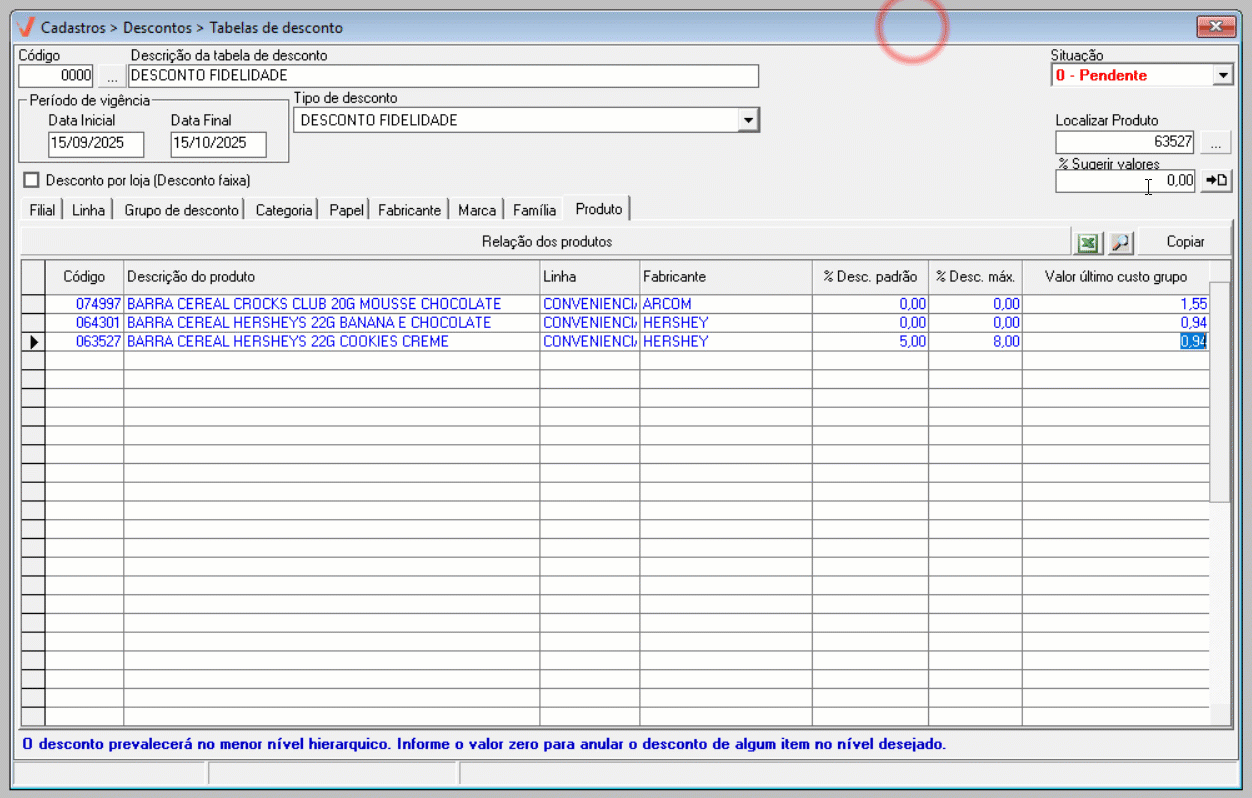 O próximo passo é informar o percentual de desconto que será aplicado ao registro. Para isso, utilize a linha das colunas "% Desc. padrão" e/ou"% Desc. máximo" para informar o valor desejado. Tecle "Enter" após cada informação para mudar de campo e repita todo o processo para inserir todos os itens e descontos correspondentes, conforme desejar.