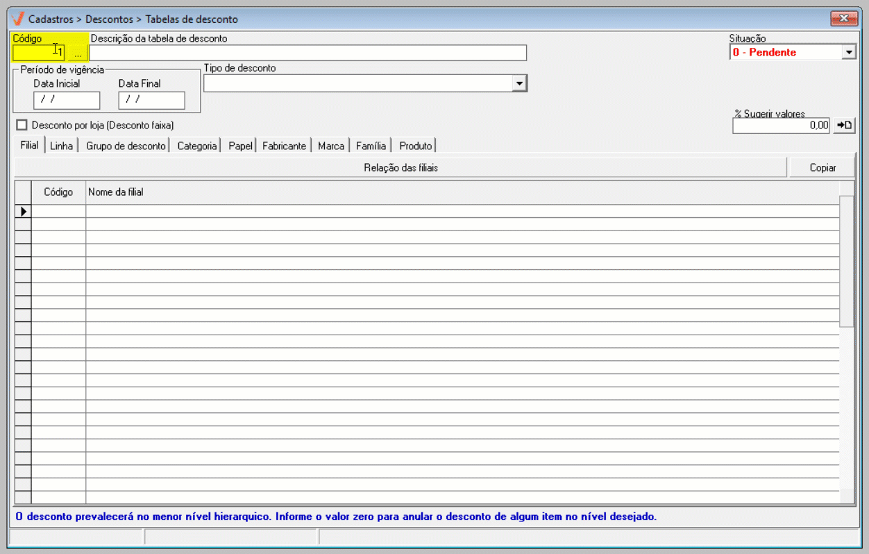 O próximo passo é configurar os detalhes dos descontos por meio das abas disponíveis na seção abaixo. Comece pela aba "Filial" e adicione todas as filiais que irão oferecer o desconto. Para isso, utilize as linhas da coluna "Código" para informar o o código de cadastro da filial, tecle >>Enter para revelar o nome correspondente no campo à frente.