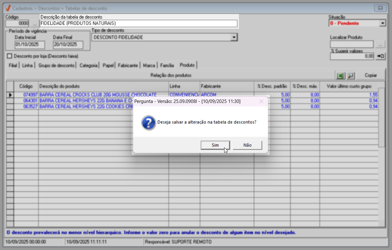 Se o usuário desejar realizar alterações na tabela, ele deve clicar na aba correspondente e fazer as modificações necessárias, ajustando os campos conforme explicado no primeiro passo, seja para remover itens ou alterar os percentuais de desconto. Para salvar as alterações, basta pressionar F2 e, em seguida, confirmar a mensagem que será exibida na tela.