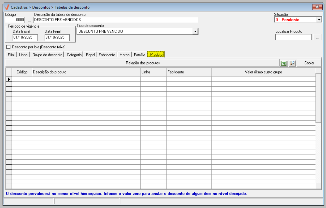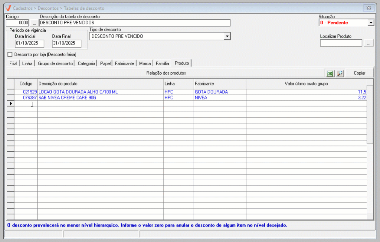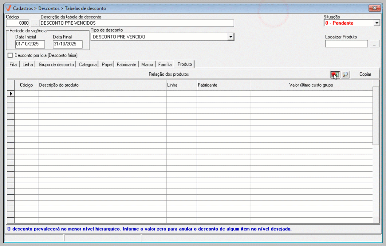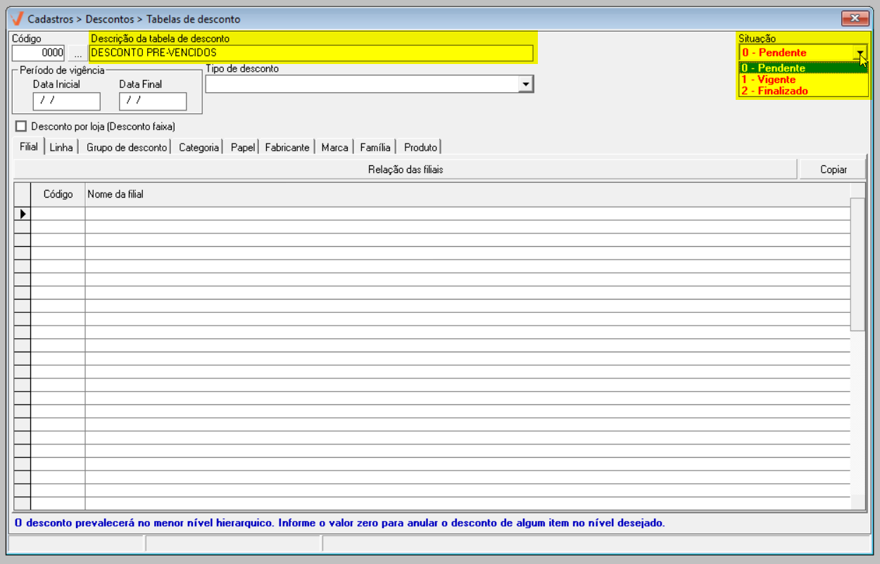 - Pendente: A tabela de desconto ainda não está disponível para uso. Ela poderá ser utilizada apenas quando o seu prazo de vigência começar.
