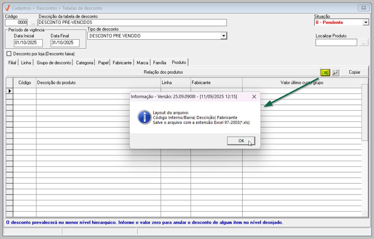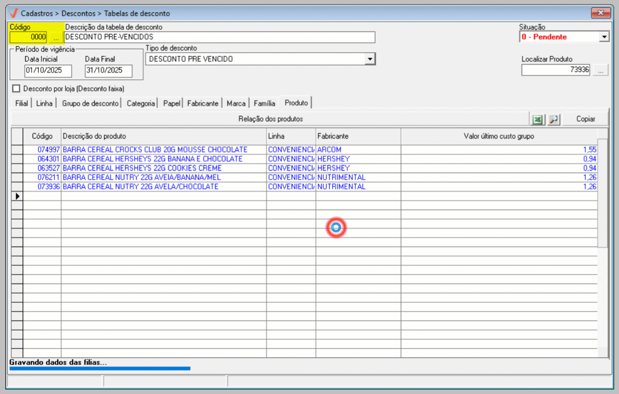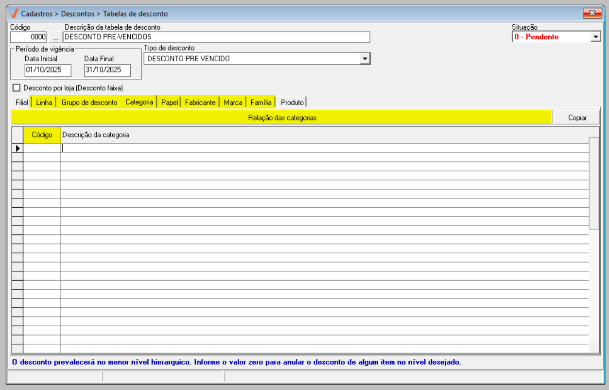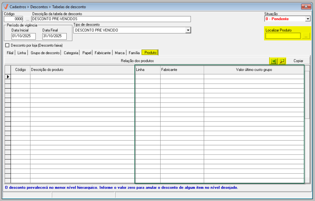 - Pendente: A tabela de desconto ainda não está disponível para uso. Ela poderá ser utilizada apenas quando o seu prazo de vigência começar.