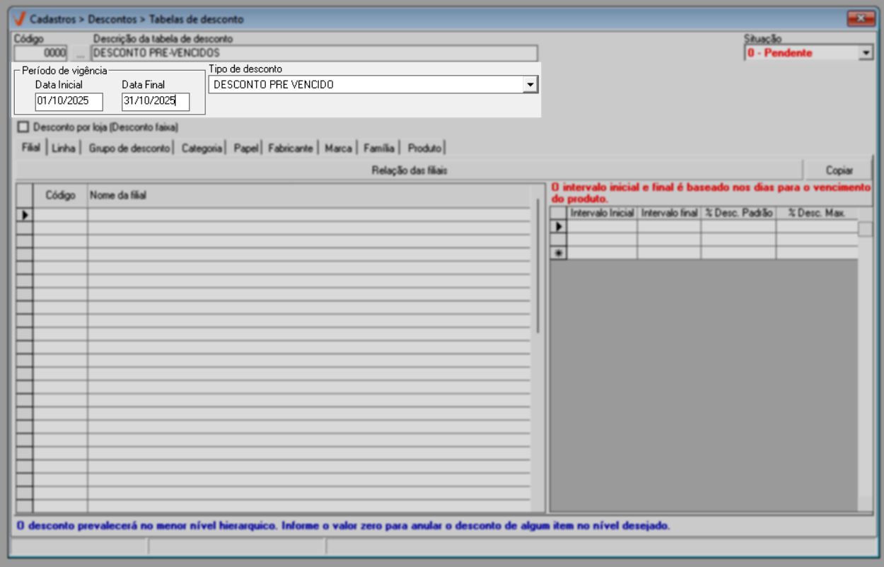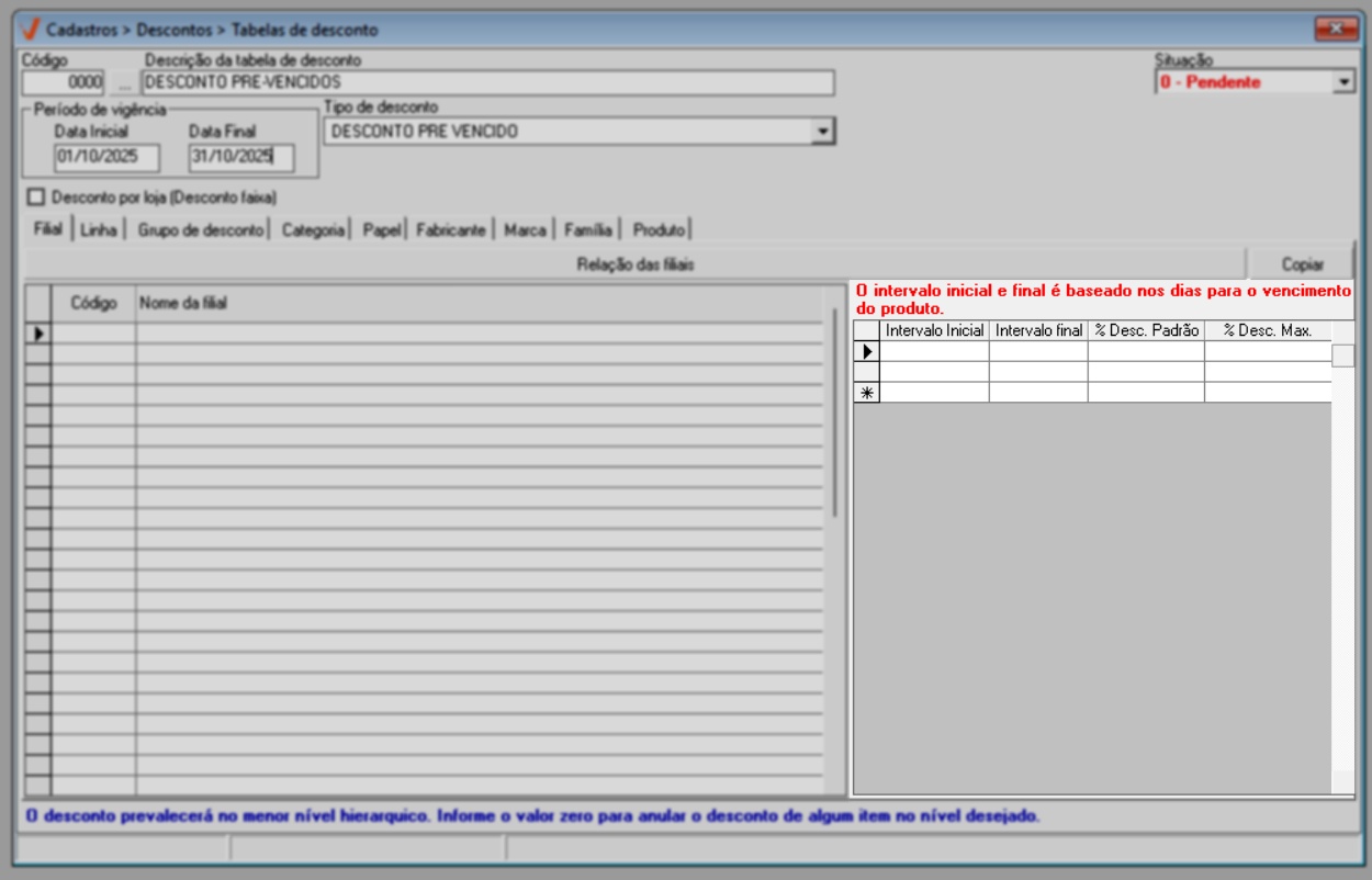 O objetivo de cadastrar e liberar uma remessa de Pré-vencidos é estabelecer uma regra de descontos específica para essa modalidade, permitindo que lojistas e varejistas aumentem as vendas de produtos próximos ao vencimento, antes que se tornem inviáveis para comercialização. Por meio desta tela, o usuário poderá cadastrar, consultar e alterar a tabela de descontos, definindo a porcentagem de desconto e, consequentemente, a redução do preço de venda dos produtos.