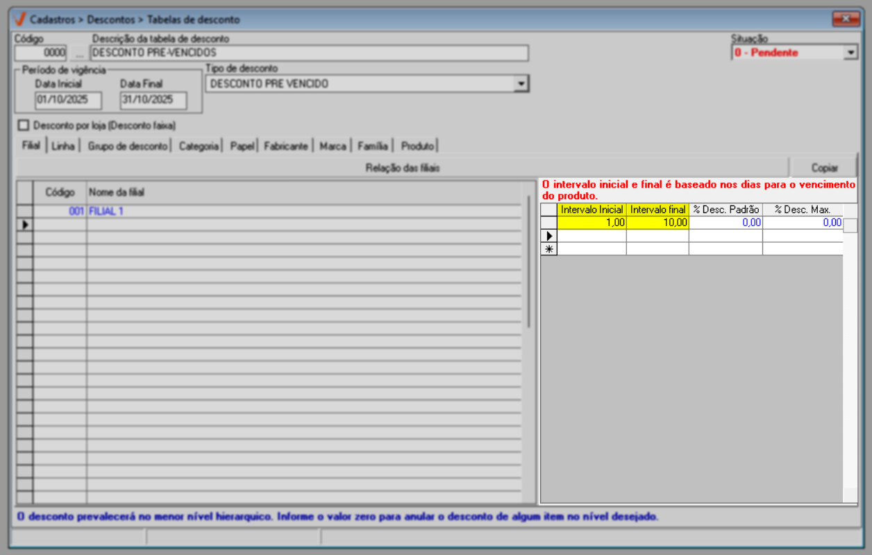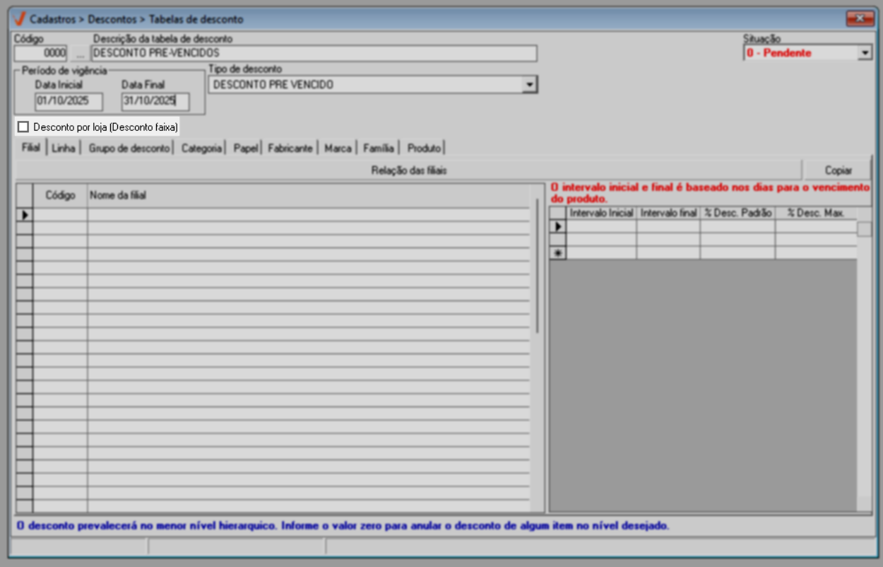 Lembre-se que, a tabela de descontos funcionará de forma regressiva, o que significa que o percentual de desconto aplicado aumentará conforme o número de dias restantes até o vencimento do produto diminui. Por exemplo, para produtos com vencimento mais próximo, o desconto será maior, enquanto para produtos com vencimento mais distante, o desconto será menor.