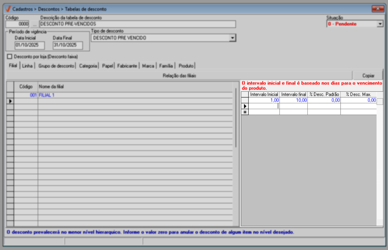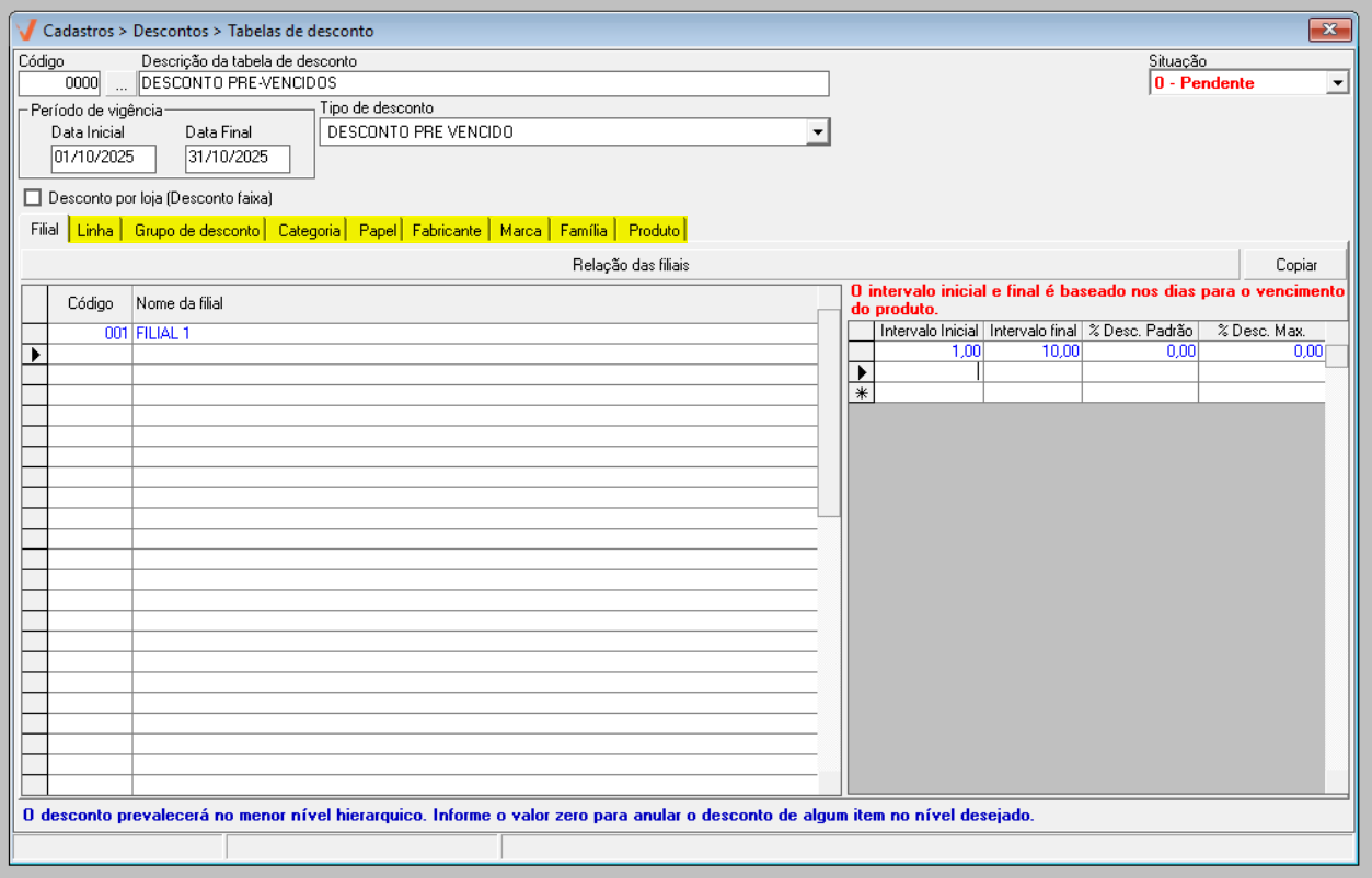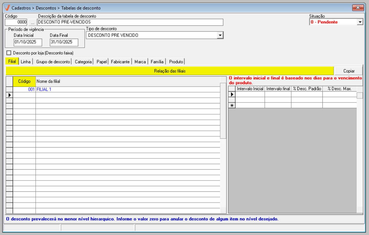 Além disso, a tela será atualizada para exibir uma parâmetro de configuração específico a este tipo de desconto, uma seção específica para informar os intervalos de descontos e percentuais que serão aplicados aos produtos, baseado nos dias para o vencimento do produto. Antes de utilizá-la, comece adicionando todas as filiais que irão oferecer o desconto.