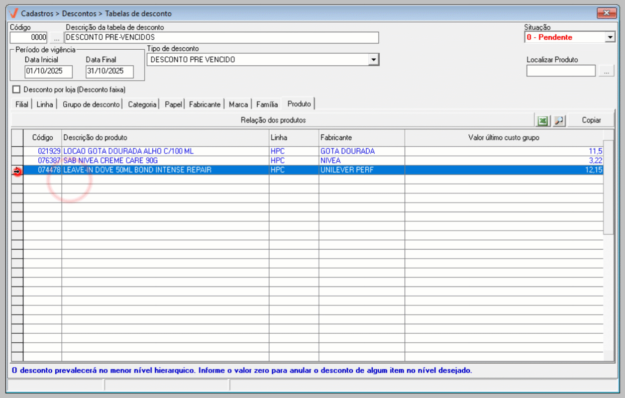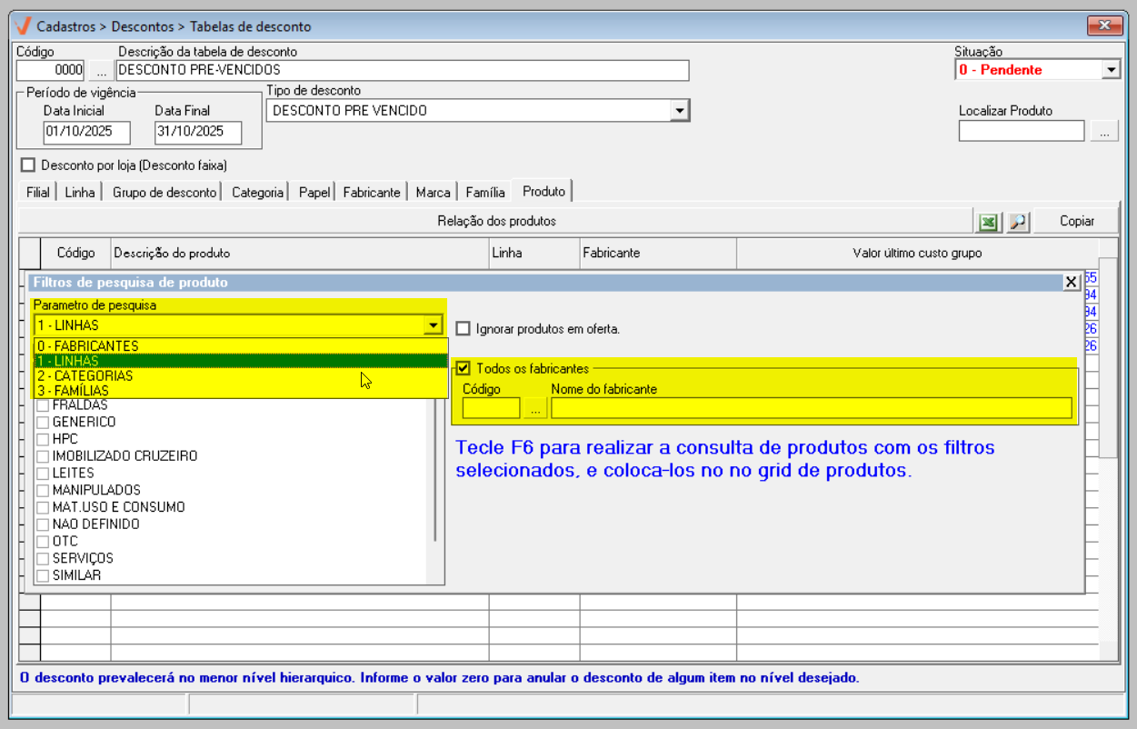 Outro aspecto importante a ser destacado, é o informativo no rodapé da tela, "O desconto prevalecerá no menor nível hierárquico". Por exemplo, caso o usuário defina 50% de desconto na aba de Linhas e 40% na aba de Produto, o sistema aplicará o desconto de 40%, que corresponde ao nível mais detalhado, ou seja, o produto específico. Em resumo, os valores configurados no nível mais específico sempre prevalecerão sobre aqueles definidos em níveis mais gerais, como a linha de produtos.
