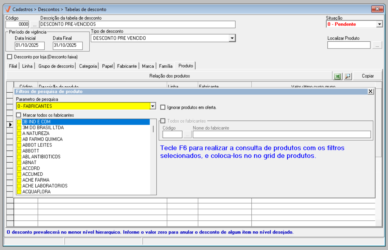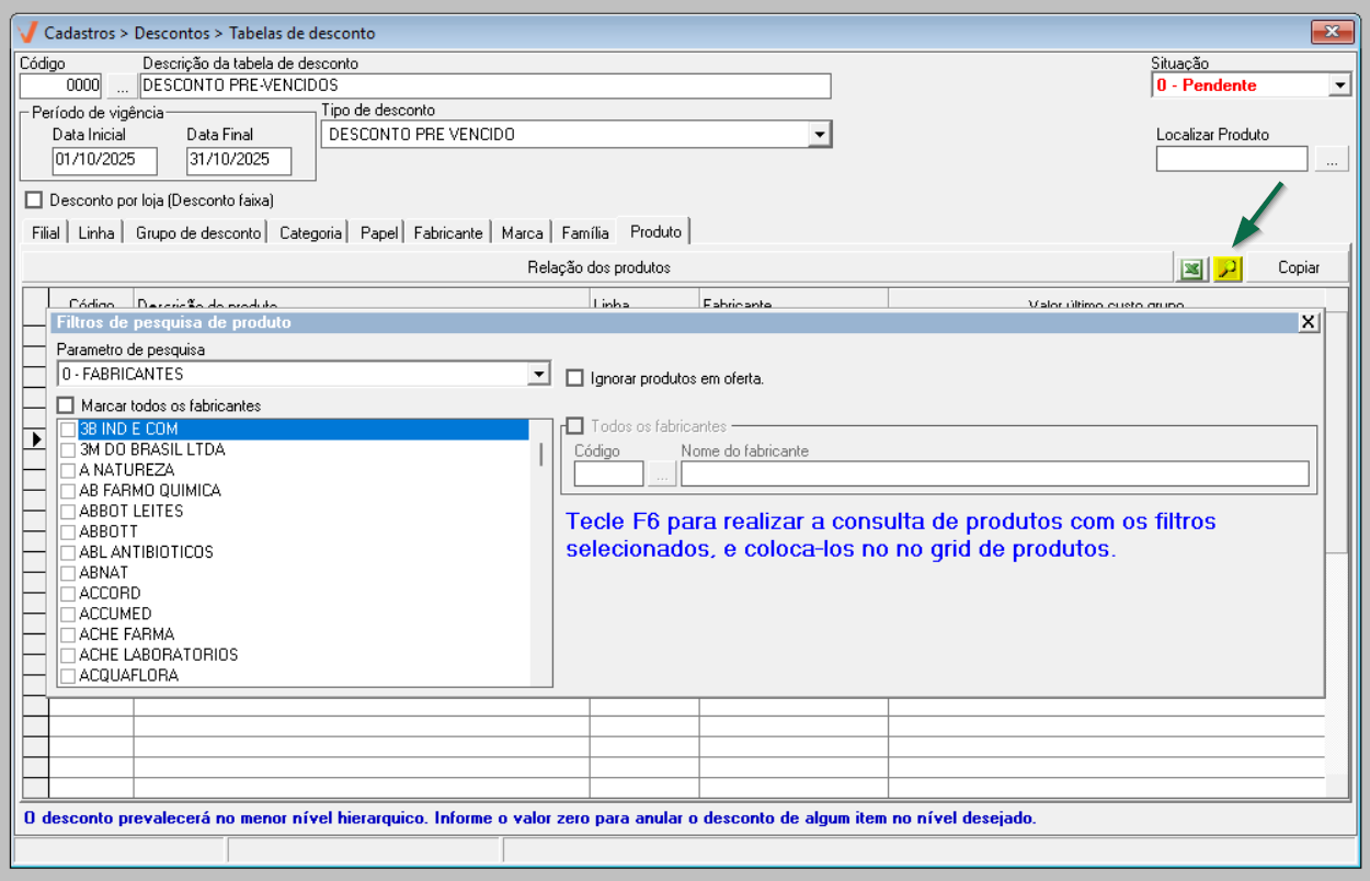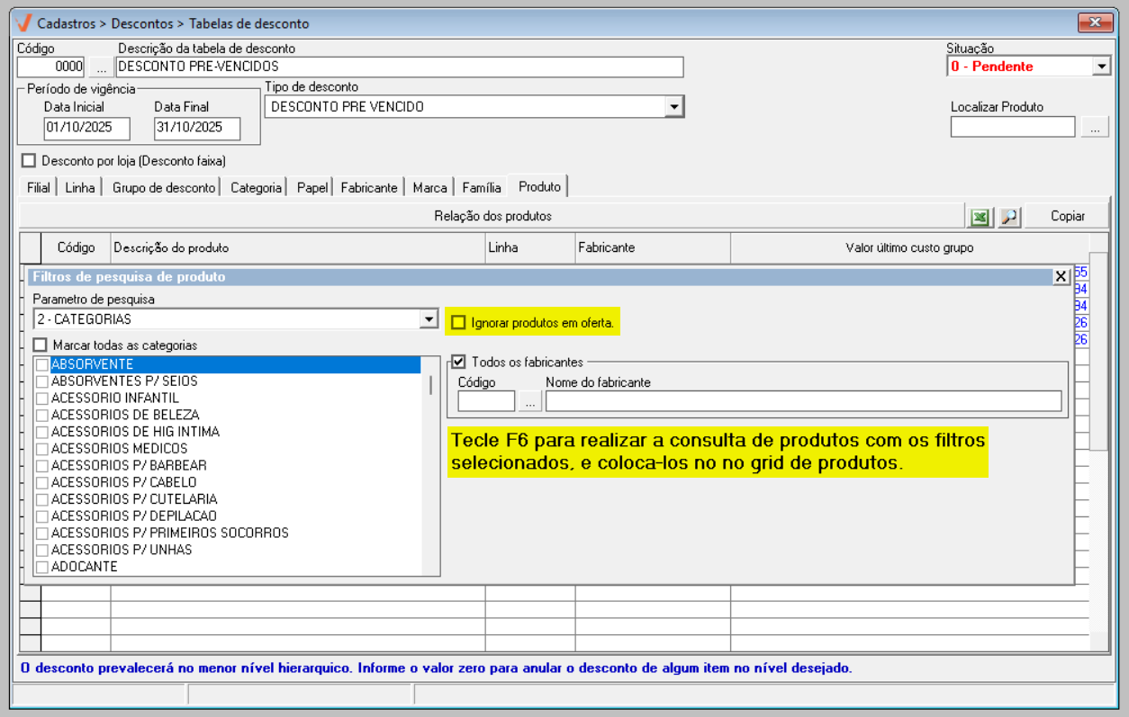 Por fim, conforme interesse, o usuário pode marcar a opção "Ignorar produtos em oferta", assim, o sistema não considerará os produtos em oferta na busca. Após configurar os filtros desejados, basta pressionar o atalho F6 para realizar a consulta dos produtos com os critérios selecionados, conforme indicado na tela.