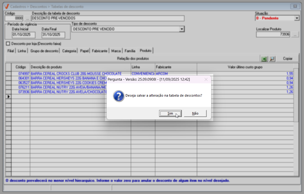 Para concluir o cadastro, pressione a tecla F2 para salvar. Em seguida, será exibida a mensagem "Deseja salvar a alteração na tabela de descontos?", clique em "Sim" para confirmar a operação. Logo depois, uma nova mensagem será apresentada informando "Registro gravado com sucesso". Clique em "Ok" para confirmar e a tela será automaticamente limpa, permitindo o início de uma nova operação.