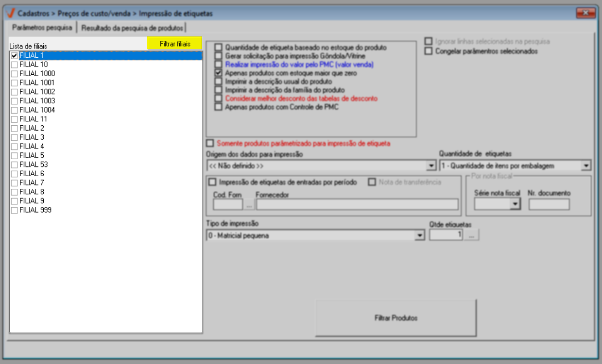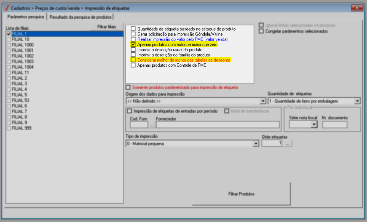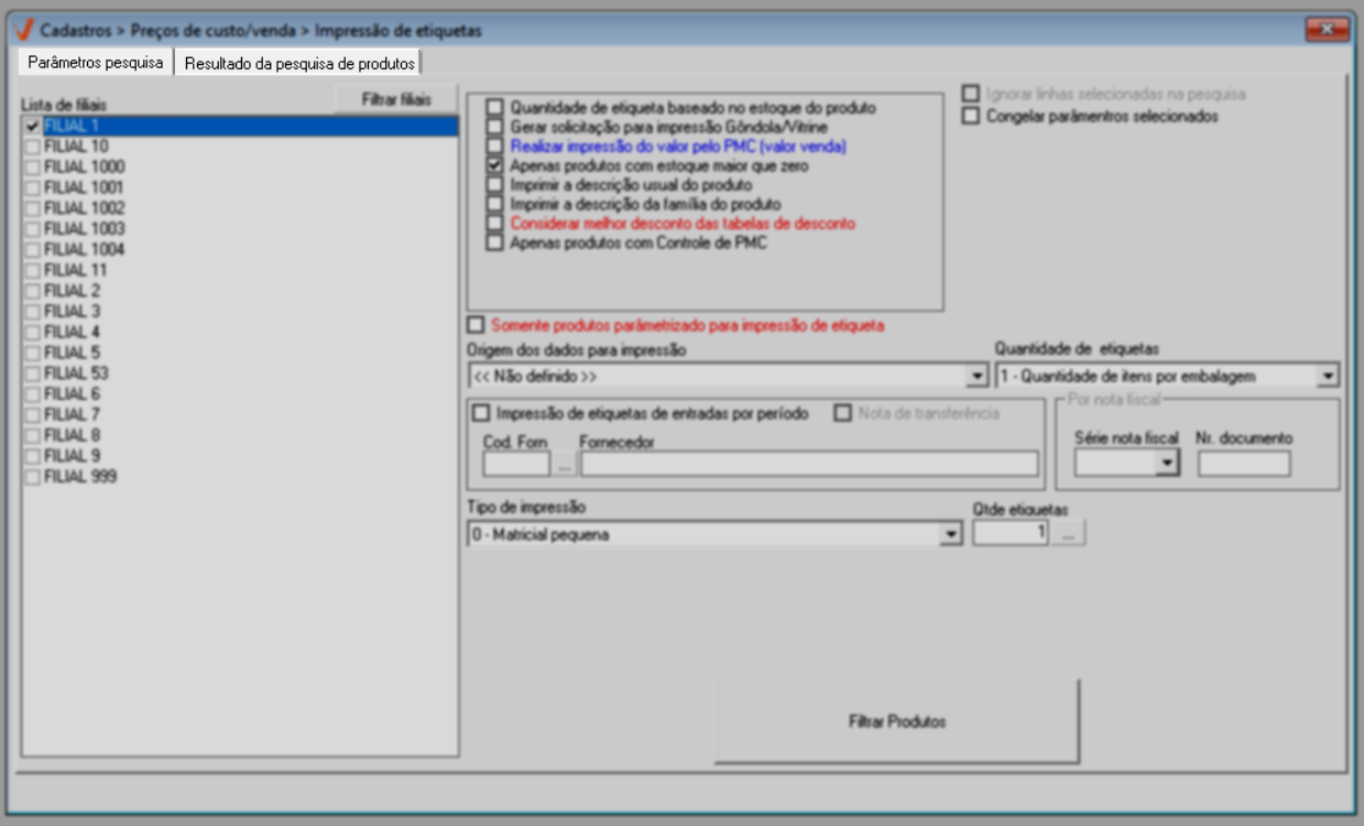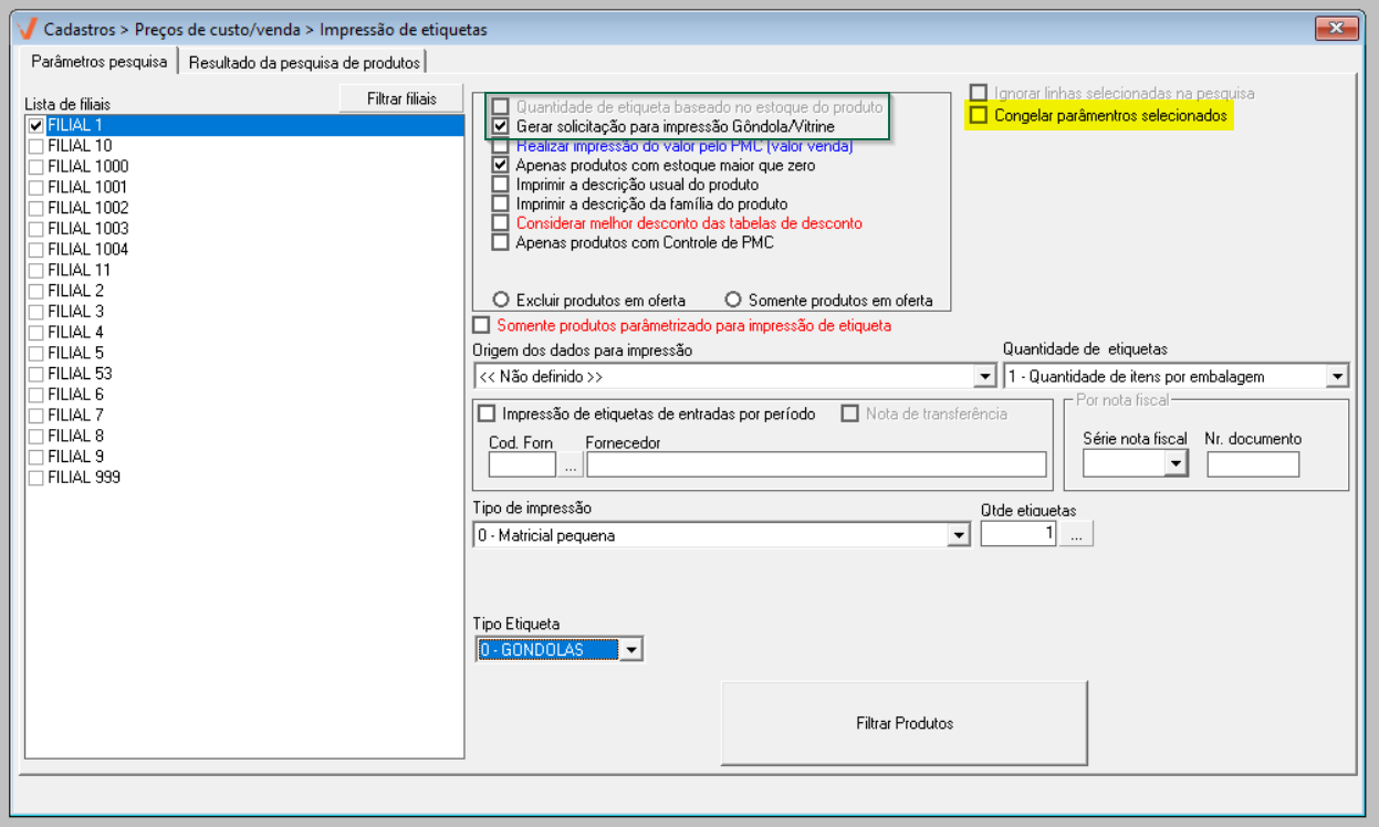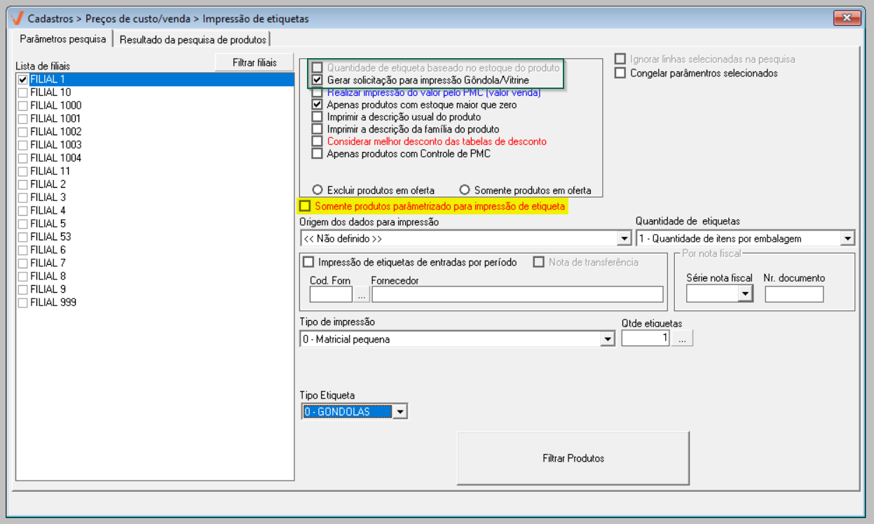 - Somente produtos parametrizados para impressão de etiqueta: Serão impressos as etiquetas apenas os produtos habilitados para esse tipo de impressão, essa configuração é realizada no cadastro do produto.