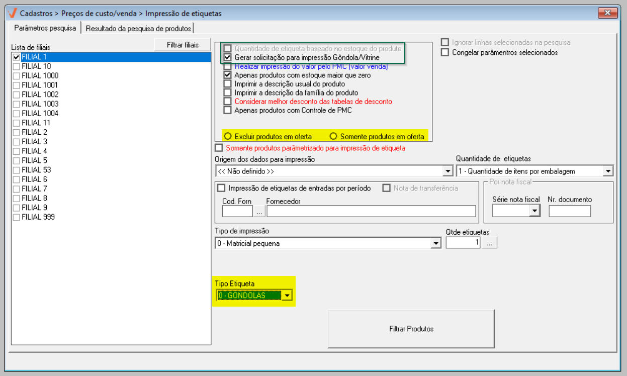- Gerar solicitação para impressão gôndola/vitrine: Essa opção habilitará novos campos de consulta que permitem ao usuário escolher se deseja "Excluir produtos em oferta" ou "Somente produtos em oferta" bem como definir o tipo de etiqueta a ser impressa, se é para "Gôndola" ou "Vitrine". Veja na imagem abaixo: