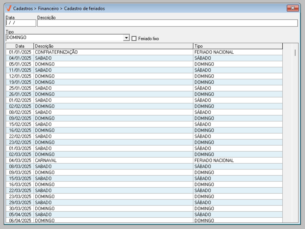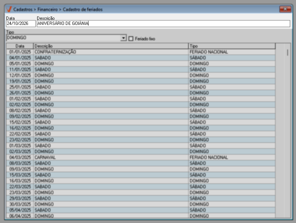 - Acesse o menu: Cadastros >> Financeiro >> Cadastro de feriados.