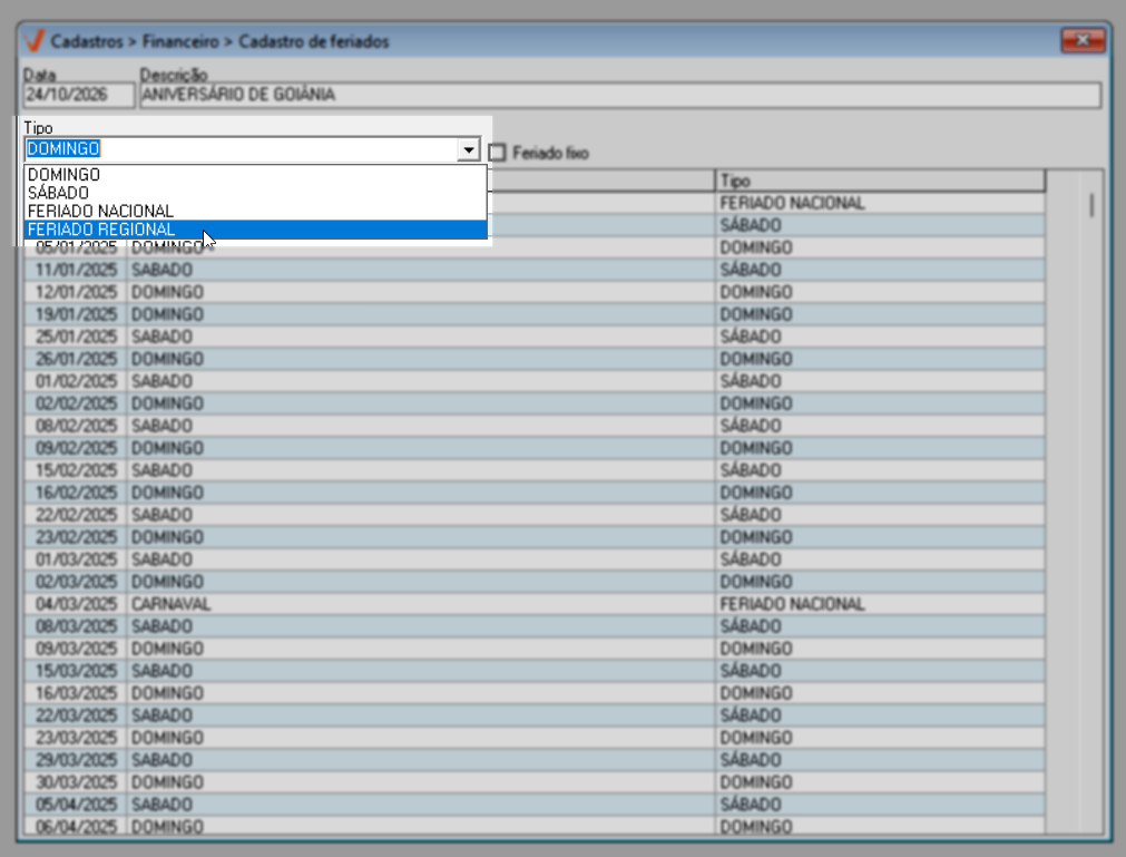 Após, no campo "Tipo", selecione a opção que identifica o tipo de data que está sendo cadastrada, por exemplo "Feriado regional".