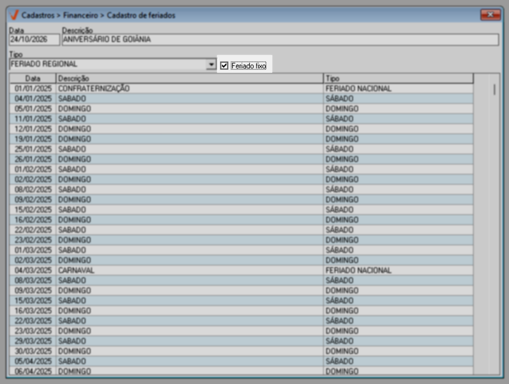 Nas operações que permitem a fixação de data, mesmo que a data esteja cadastrada nesta tela, não é aplicado o ajuste automático para o próximo dia útil. Nesses casos, a data permanece conforme definida pelo usuário, mesmo que corresponda a um fim de semana ou feriado.