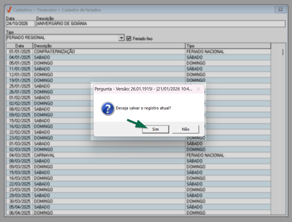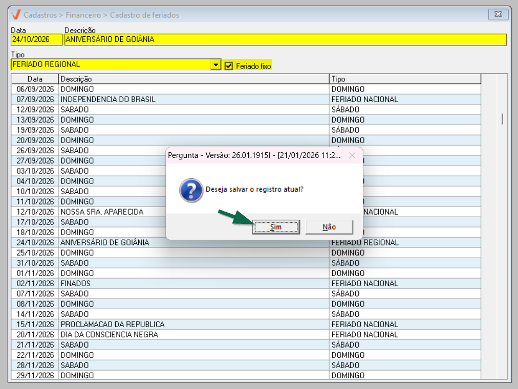 Por fim, após preencher todas as informações, pressione o atalho >> F2 para salvar o cadastro e confirme a mensagem apresentada logo em seguida. A partir desse momento, sempre que a data cadastrada estiver associada a um documento a pagar, a receber, à conciliação ou a um relatório, o sistema realizará automaticamente o ajuste da data para o próximo dia útil, conforme descrito anteriormente, exceto nas operações que permitem a fixação de data.
