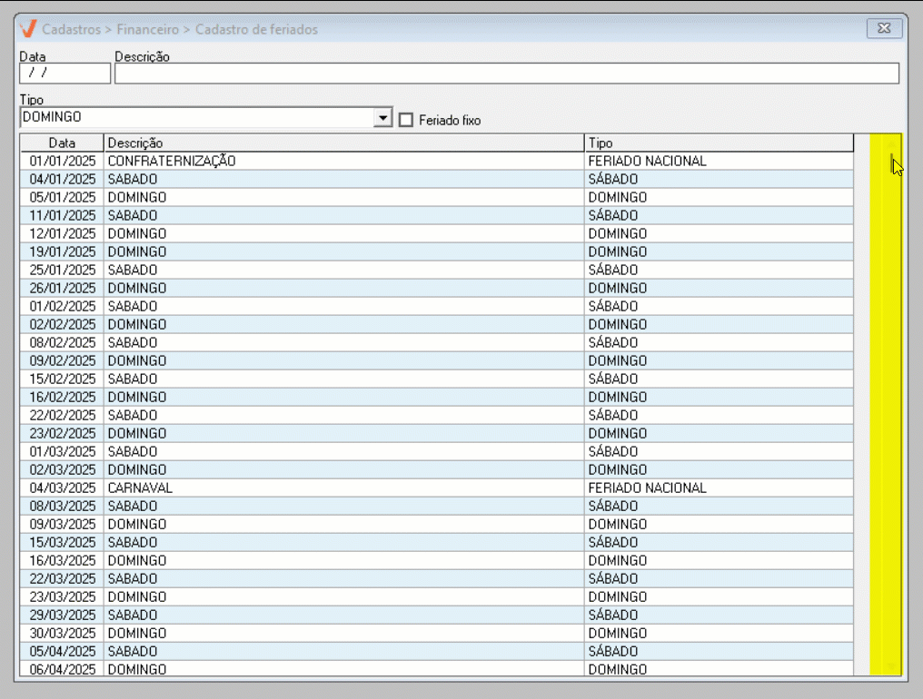 Clique na barra de navegação à direita da tela e arraste-a ou clique na seta inferior para percorrer a lista de cadastro de feriados até localizar o registro desejado. Para visualizar os detalhes do registro na tela, dê um duplo clique sobre ele.