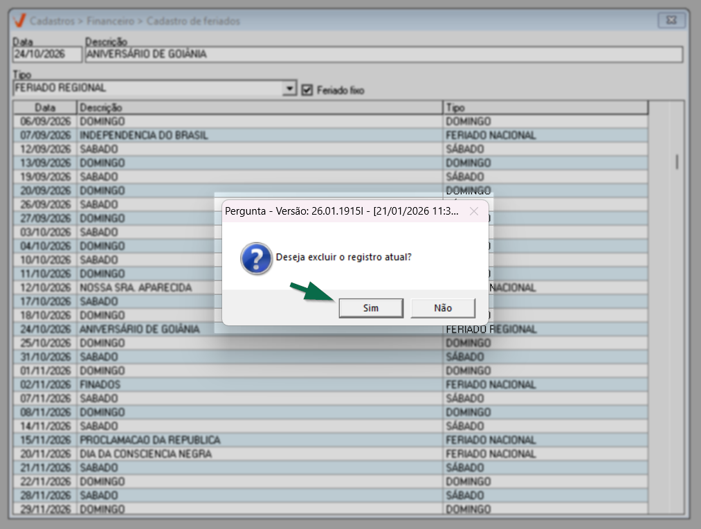 Caso seja necessário excluir uma data cadastrada, após localizar e detalhar o registro, pressione a tecla de atalho >> F5 e confirme a mensagem exibida para efetivar a exclusão.