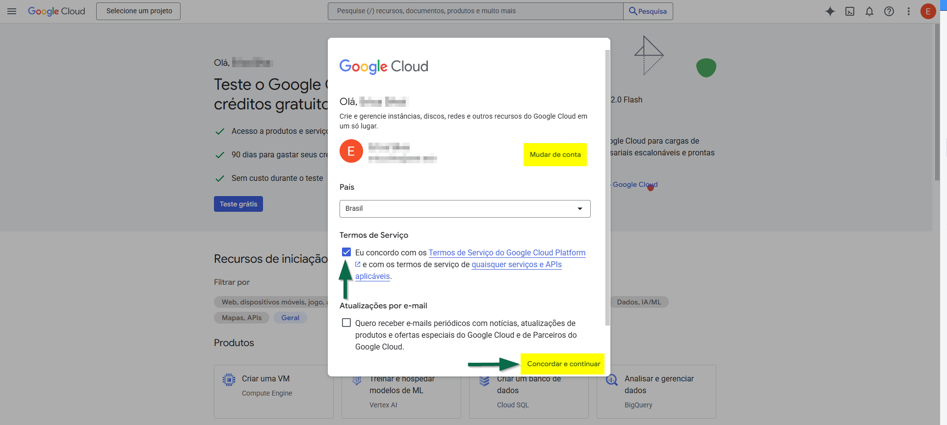 Ao acessar o Google Cloud Console, caso o usuário já esteja conectado a uma conta do Gmail, será exibida uma tela identificando a conta em uso. Nela, é necessário aceitar os "Termos de Serviço" e clicar em >> Concordar e continuar para prosseguir. Se a conta exibida não for a desejada, basta clicar em "Mudar de conta" e realizar o login com o e-mail correto. Por outro lado, caso o usuário ainda não esteja autenticado, ao acessar o Google Cloud a tela de login será exibida automaticamente; nesse caso, é só informar as credenciais da conta Google e confirmar o acesso.