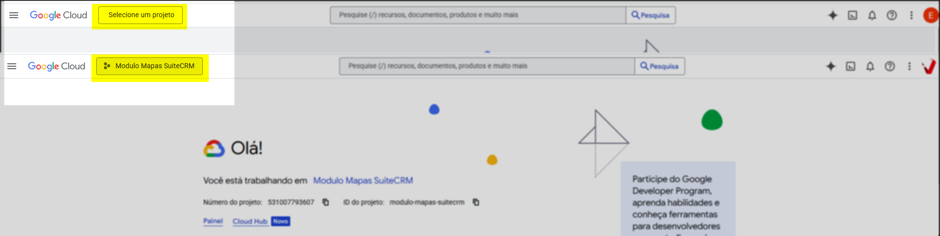 Em seguida, de acordo com o tipo de conta utilizada no acesso, o botão localizado no canto superior esquerdo da tela apresentará uma descrição específica. Caso o usuário esteja logado em uma conta corporativa (ex.: @nomedaempresa), o botão será exibido como >> Selecionar um projeto. Se o acesso estiver sendo feito por uma conta pessoal (ex.: @gmail.com), esse botão será exibido com o nome >> Módulo Mapas Suite CRM. De acordo com o tipo de conta, clique no botão para prosseguir.