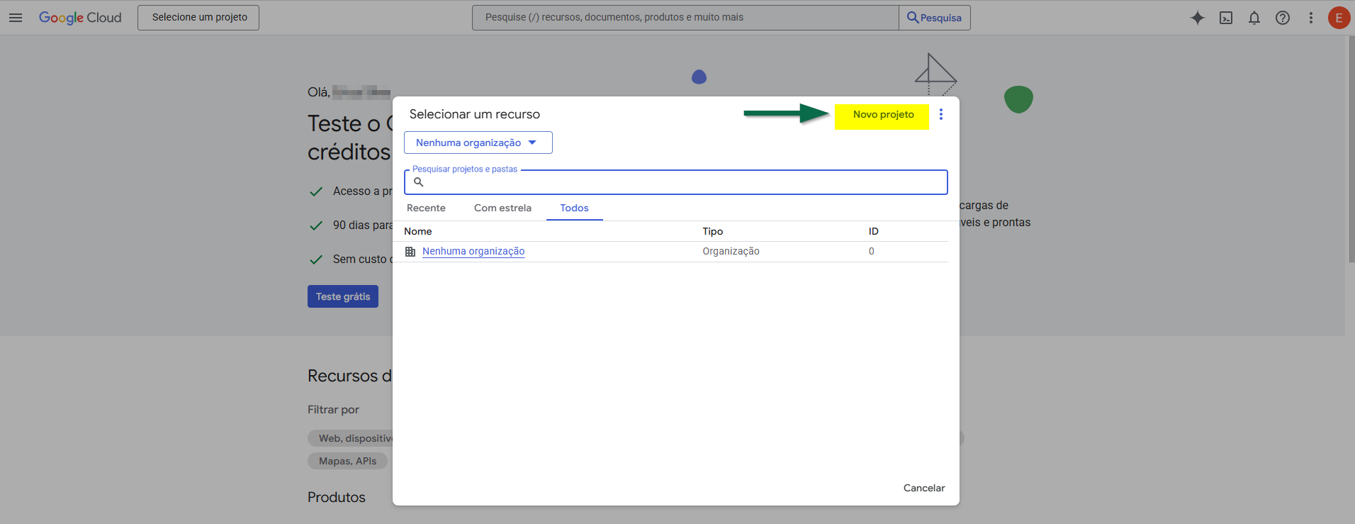 Na sequência, uma nova tela será exibida para dar continuidade à configuração. Portanto, clique em >> Novo projeto.
