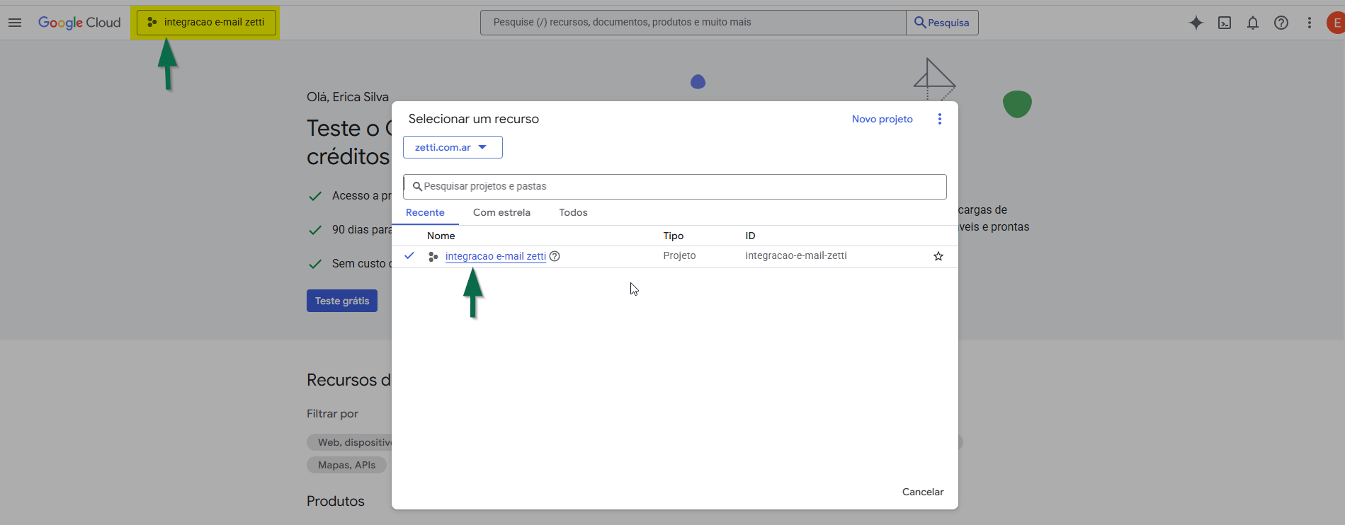 Em seguida, clique novamente no botão localizado no canto superior esquerdo da tela. Nesse momento, ele estará identificado com o nome atribuído ao projeto criado. Na tela exibida na sequência, o projeto aparecerá listado; localize-o e clique sobre ele para selecioná-lo e dar continuidade à configuração.