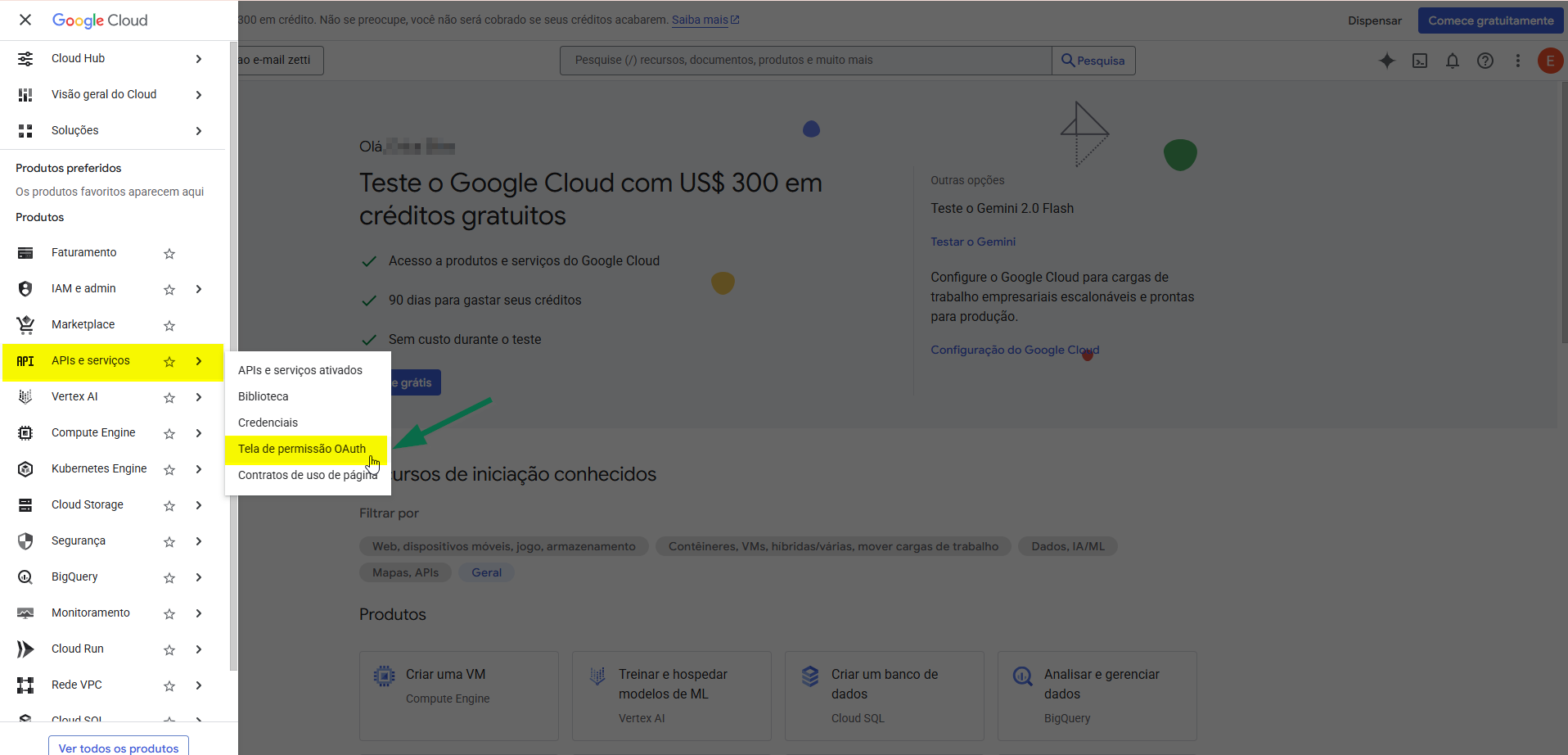 Em seguida, no menu exibido à esquerda, selecione a opção "APIs e serviços" e, depois, clique em "Tela de permissão OAuth".