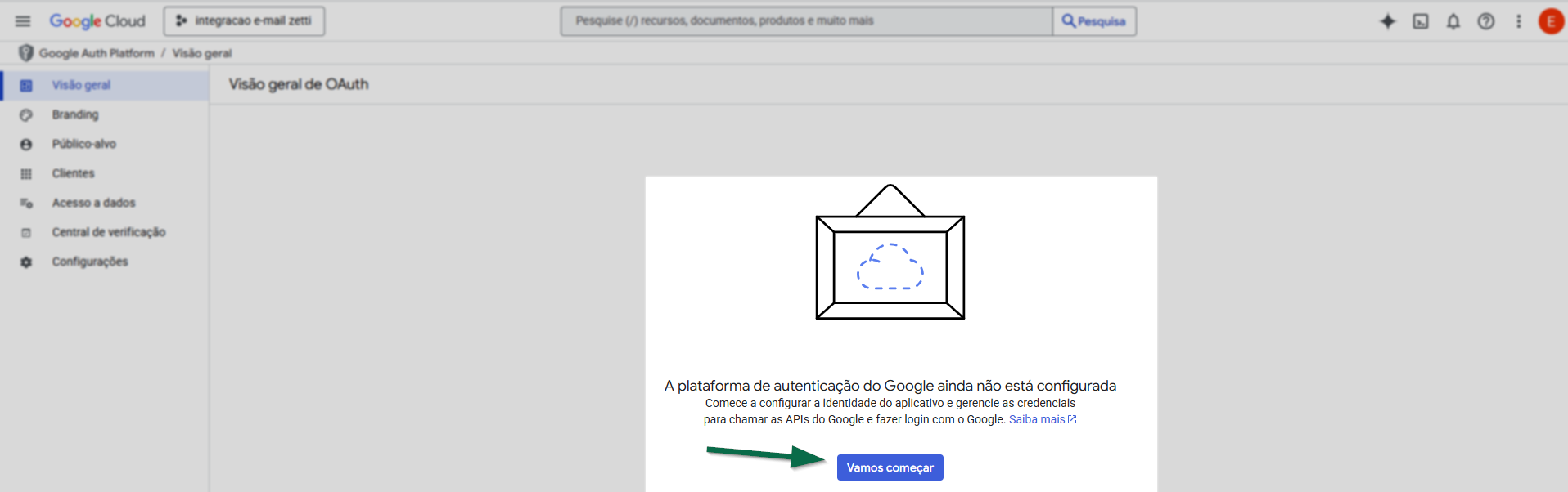 Feito isso, será exibida a tela “Visão geral de OAuth”. No centro da página, aparecerá uma mensagem informando que a plataforma de autenticação do Google ainda não está configurada. Para iniciar o processo, clique em >> Vamos começar.