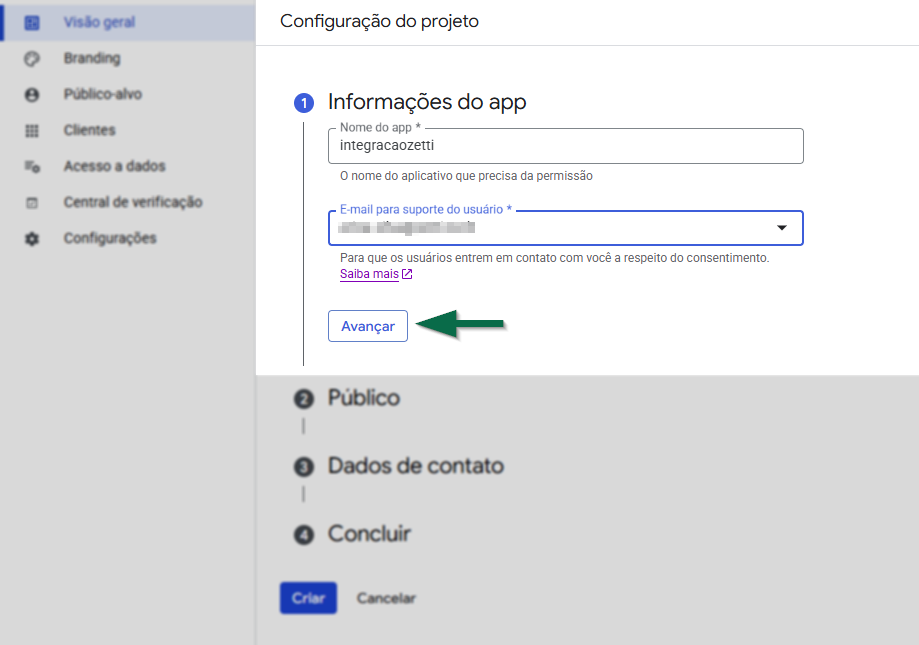 Na tela seguinte, configure as informações do projeto. Comece pelas "Informações do APP". No primeiro campo informe "O nome do aplicativo que precisa da permissão", e no campo a seguir informe um endereço de "E-mail para suporte do usuário". Após, clique em >> Avançar.
