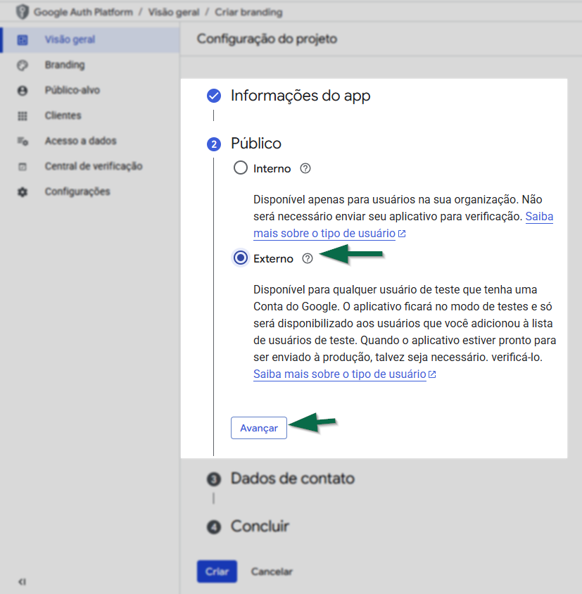 Em seguida, marque a opção “Externo” (mais comum para aplicações SaaS). Essa opção indica ao Google que a aplicação será utilizada fora do ambiente interno da empresa, como em sistemas web, plataformas online ou soluções em nuvem. Ao selecionar essa configuração, o usuário permite que outros usuários externos realizem a autenticação, normalmente por meio de um navegador, utilizando URLs públicas de redirecionamento, que são obrigatórias nesse tipo de integração. Após a marcação, clique em >> Avançar.