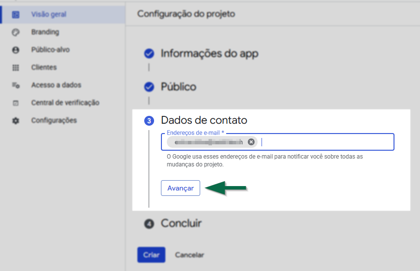 Em "Dados de contato", informe um ou mais endereços de e-mail. Esses contatos serão utilizados pelo Google para enviar notificações sobre todas as mudanças do projeto. Informados o(s) e-mail(s), clique em >> Avançar.