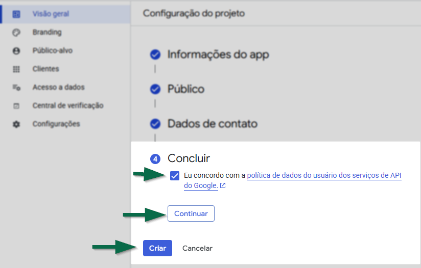Para concluir, marque a opção para concordar com a política de dados do usuário dos serviços de API do Google. Em seguida, clique em >> Continuar e, depois, em >> Criar para finalizar a configuração. Assim, o usuário retorna para a tela principal.