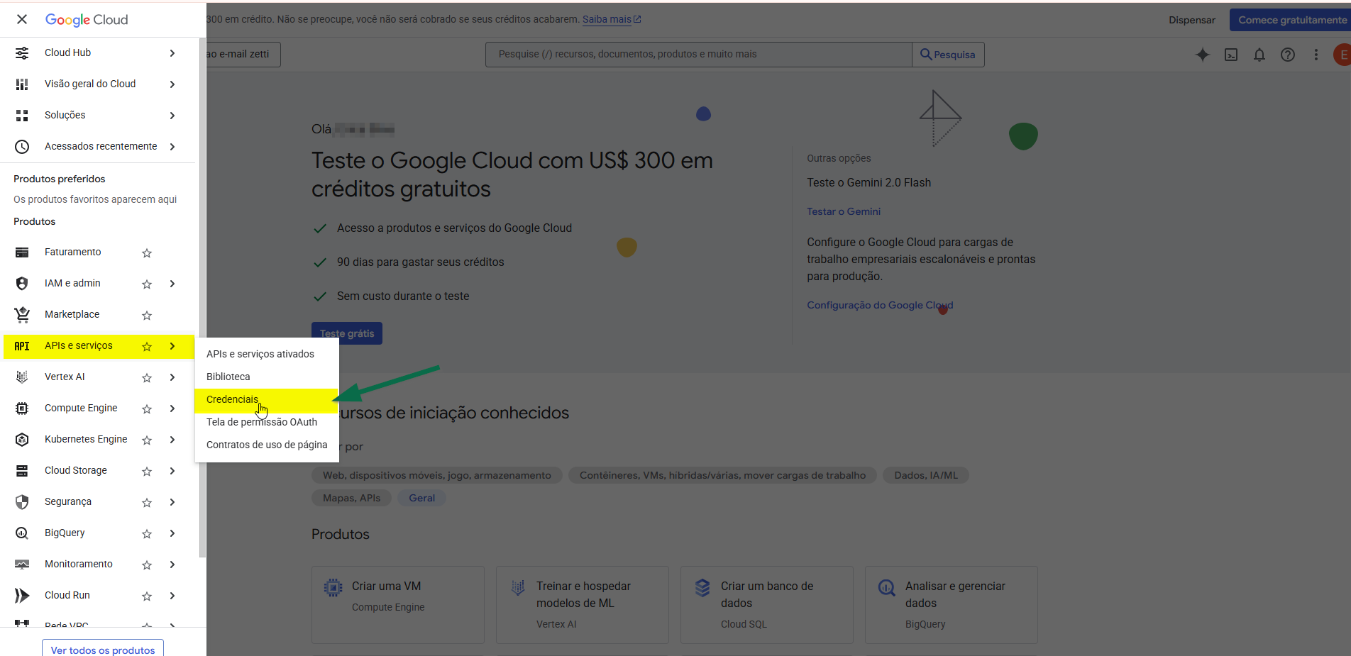 Em seguida, no menu exibido à esquerda, selecione a opção "APIs e serviços" e, depois, clique em "Credenciais".