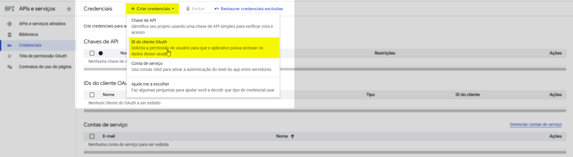 Na tela de credenciais, clique em " + Criar credenciais" e selecione a opção "ID do cliente OAuth".
