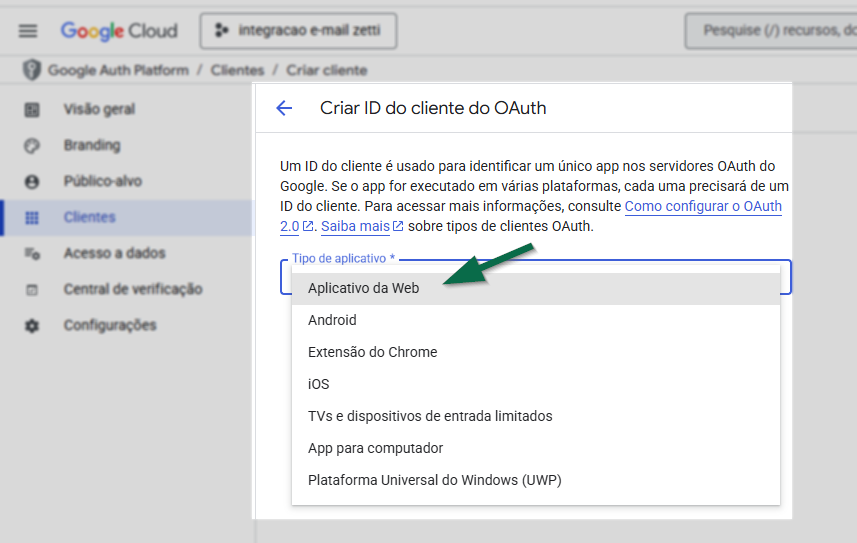 Depois disso, informe o tipo de aplicativo como "Aplicativo da Web".