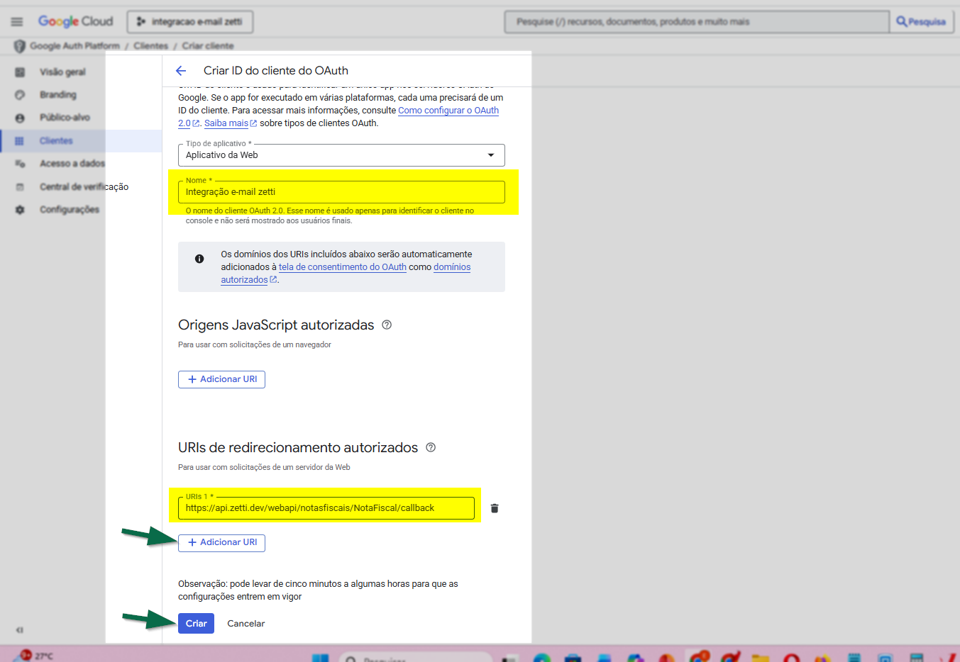 - URI de Redirecionamento: Selecione o tipo "Web" e informe no campo ao lado, o seguinte: endereço https://api.zetti.dev/webapi/notasfiscais/NotaFiscal/callback.